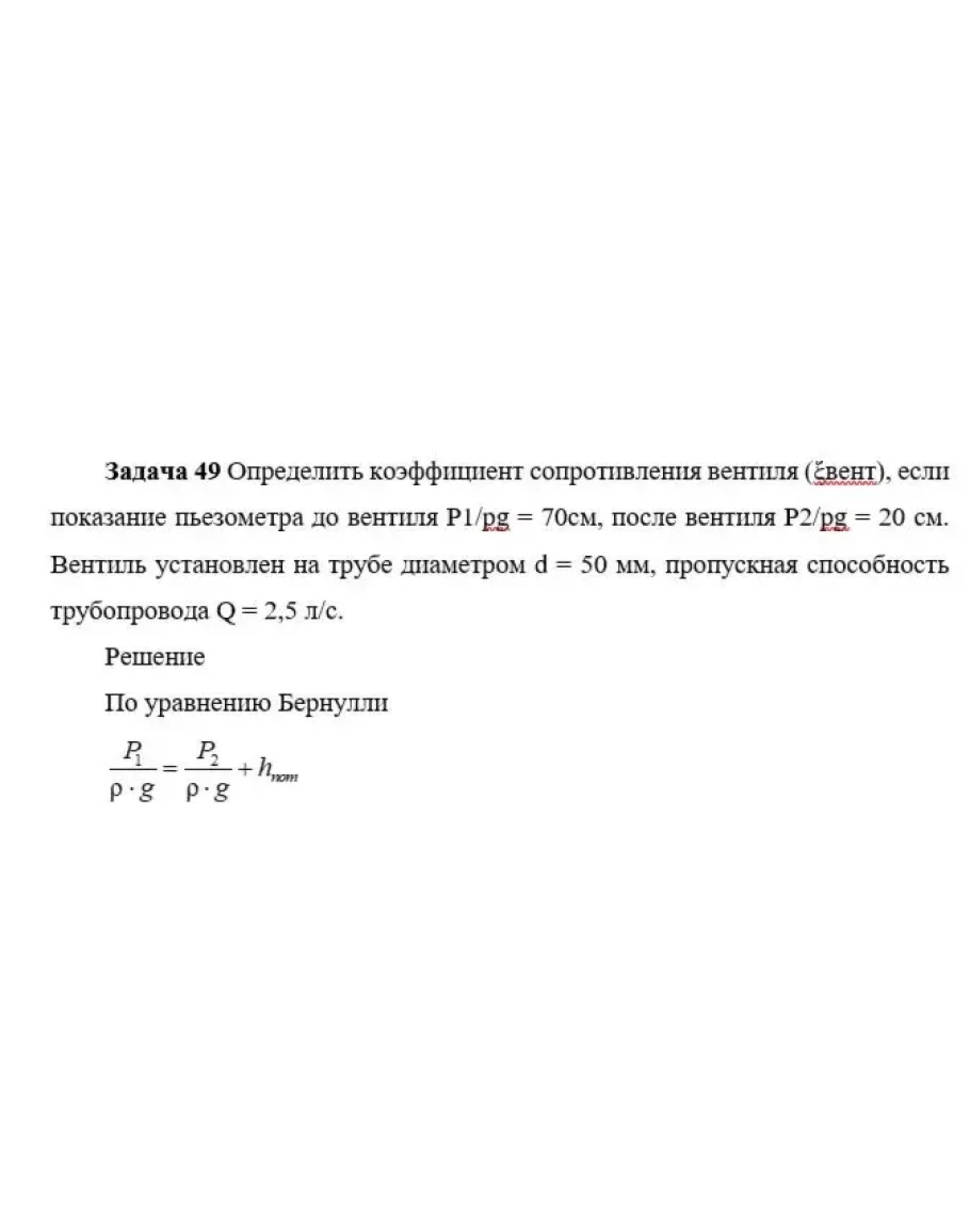 Задача 49 Определить коэффициент сопротивления вентиля (ξвент), если показание пьезометра до вентиля P1/pg = 70см, после вентиля P2/pg = 20 см. Вентиль установлен на трубе диаметром d = 50 мм, пропускная способность трубопровода Q = 2,5 л/с.
