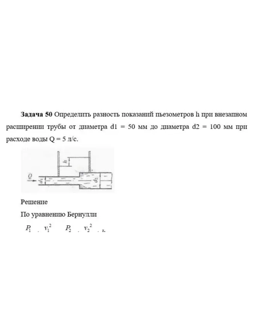 Задача 50 Определить разность показаний пьезометров h при внезапном расширении трубы от диаметра d1 = 50 мм до диаметра d2 = 100 мм при расходе воды Q = 5 л/с.