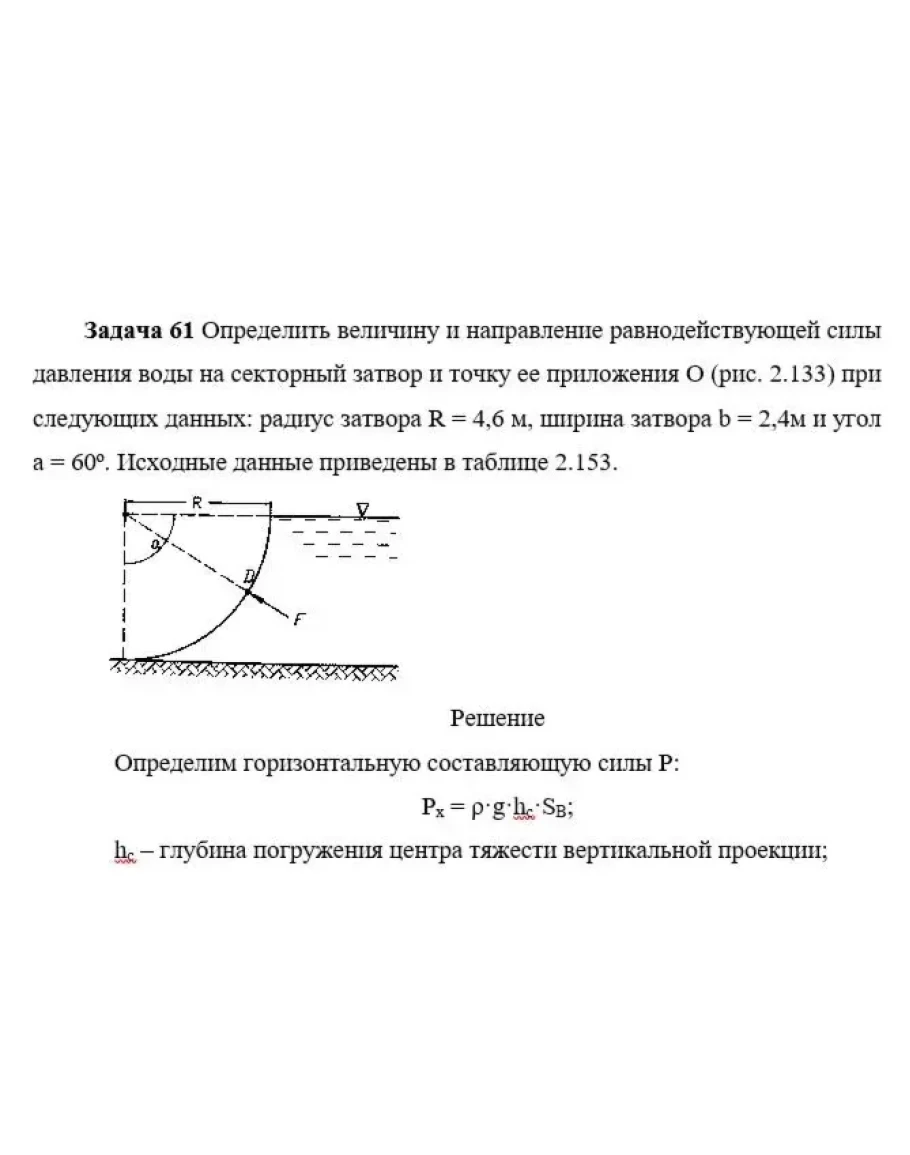 Задача 61 Определить величину и направление равнодействующей силы давления воды на секторный затвор и точку ее приложения О (рис. 2.133) при следующих данных: радиус затвора R = 4,6 м, ширина затвора b = 2,4м и угол а = 60º. Исходные данные приведены в таблице 2.153.