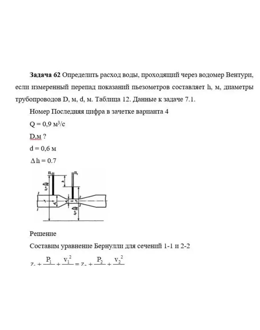 если измеренный перепад показаний пьезометров составляет h, м, диаметры трубопроводов D, м, d, м. Таблица 12. Данные к задаче 7.1.