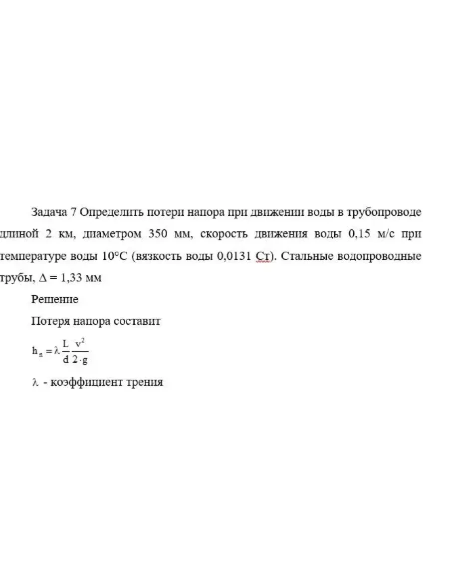 Задача 7 Определить потери напора при движении воды в трубопроводе длиной 2 км, диаметром 350 мм, скорость движения воды 0,15 м/с при температуре воды 10°С (вязкость воды 0,0131 Ст). Стальные водопроводные трубы, Δ = 1,33 мм