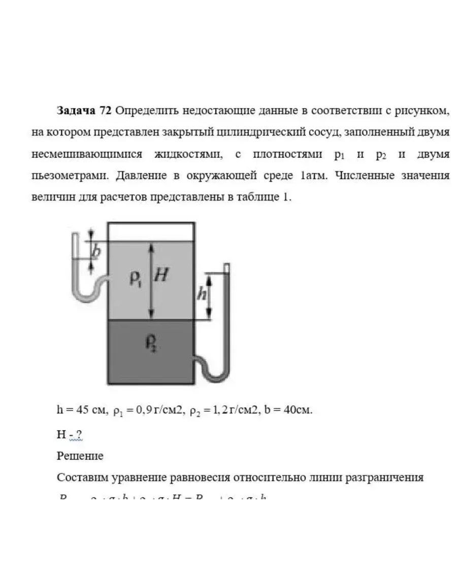 Задача 72 Определить недостающие данные в соответствии с рисунком, на котором представлен закрытый цилиндрический сосуд, заполненный двумя несмешивающимися жидкостями, с плотностями p1 и р2 и двумя пьезометрами. Давление в окружающей среде 1атм. Численные значения величин для расчетов представлены в таблице 1.