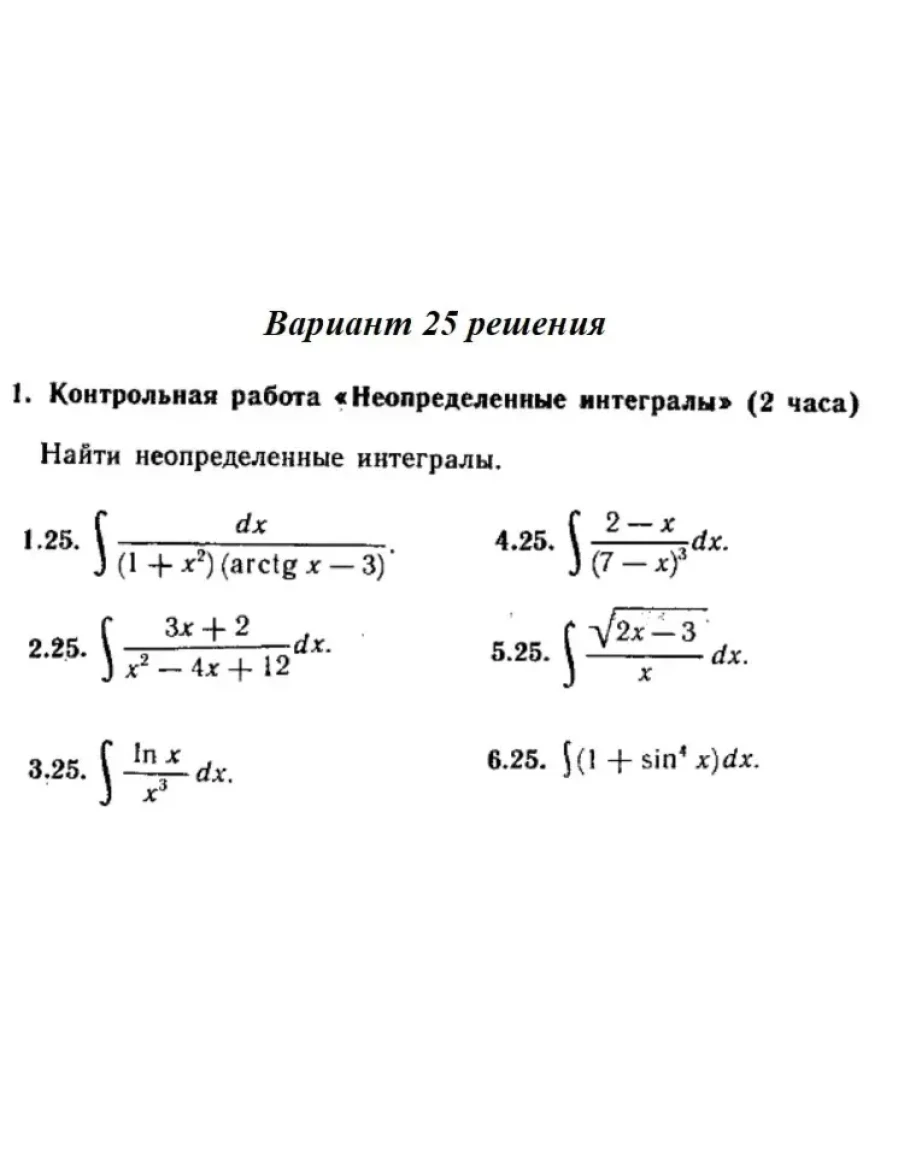 Решения 6-и заданий на тему "Неопределенные интегралы" Контрольная работа на стр. 340 Рябушко части 2 вариант 25