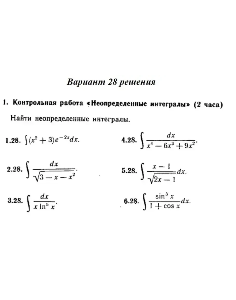 Решения 6-и заданий на тему "Неопределенные интегралы" Контрольная работа на стр. 340 Рябушко части 2 вариант 28