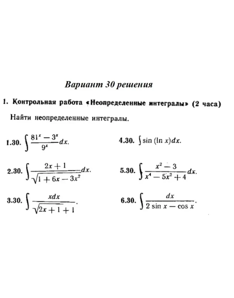 Решения 6-и заданий на тему "Неопределенные интегралы" Контрольная работа на стр. 340 Рябушко части 2 вариант 30