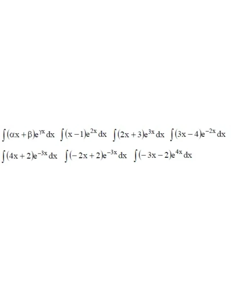 ∫(αx+β)e^(γx)dx, ∫(x−1)e^(2x)dx, ∫(2x+3)e^(3x)dx, ∫(3x−4)e^(−2x)dx, ∫(4x+2)e^(−3x)dx, ∫(−2x+2)e^(−3x)dx, ∫(−3x−2)e^(4x)dx