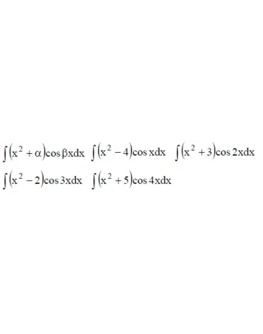 ∫(x^2+α)cosβxdx, ∫(x^2−4)cosxdx, ∫(x^2+3)cos2xdx, ∫(x^2−2)cos3xdx, ∫(x^2+5)cos4xdx