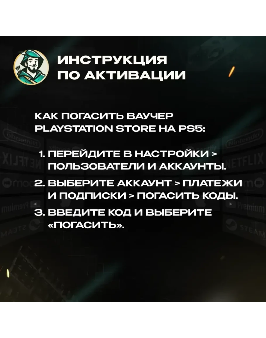 При оплате вы получаете уникальный 12-значный код для пополнения вашей карты PSN. Доступно только для аккаунтов с регионом ИТАЛИЯ. Моментальная выдача