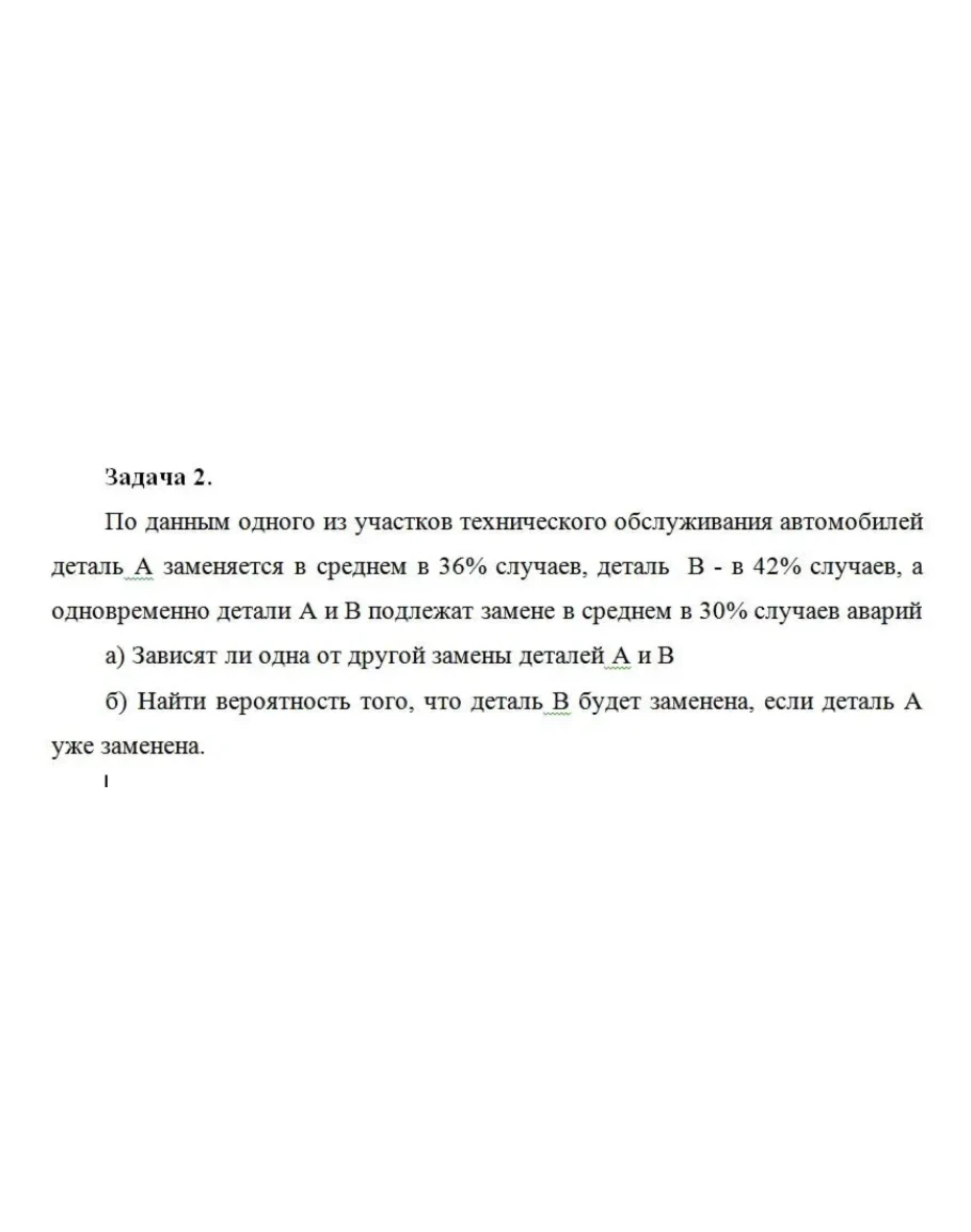 По данным одного из участков технического обслуживания автомобилей деталь А заменяется в среднем в 36% случаев, деталь В - в 42% случаев, а одновременно детали А и В подлежат замене в среднем в 30% случаев аварий