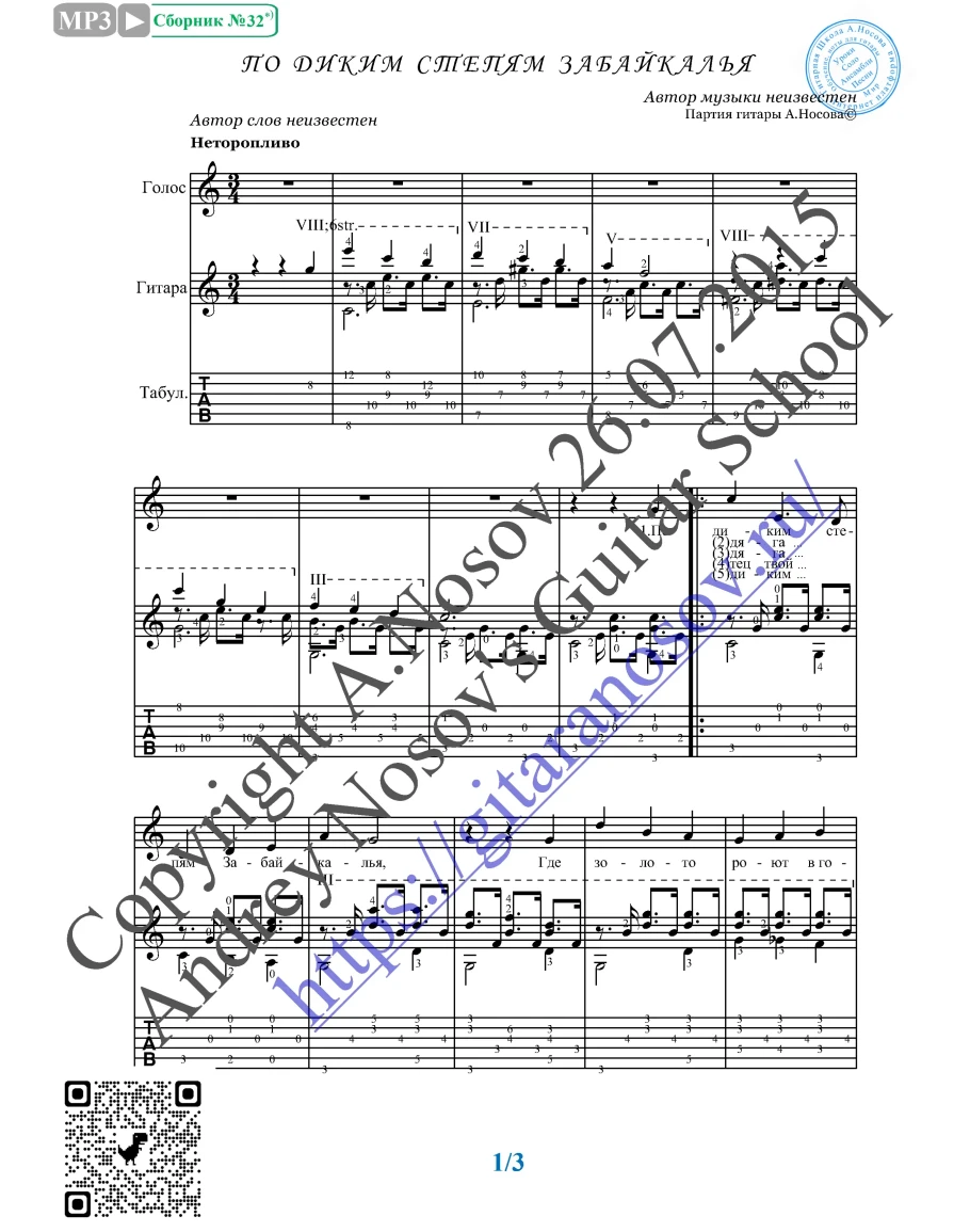 Кликните "Подробнее" для получения дополнительной информацииВашему вниманию предлагается композиция "По диким степям Забайкалья (Русская народная песня)", предназначенная для вокала в сопровождении 6-ти струнной гитары (pdf / png*). Запись выполнена нотами и включает в себя партию вокала с подтекстовкой, партию гитары с подробнейшей аппликатурой, текст песни (НА РУССКОМ ЯЗЫКЕ). Партия гитары продублирована табулатурой. Прилагается ссылка на скачивание mp3.