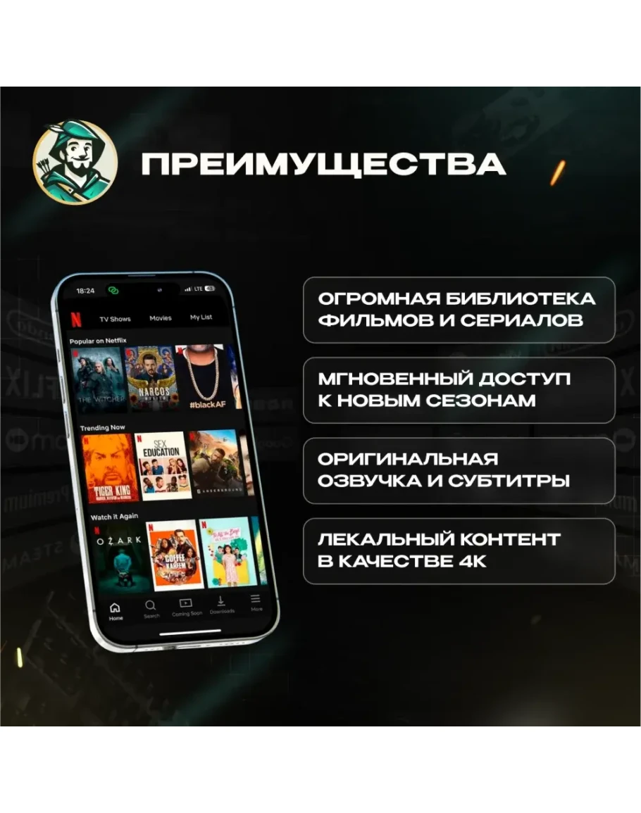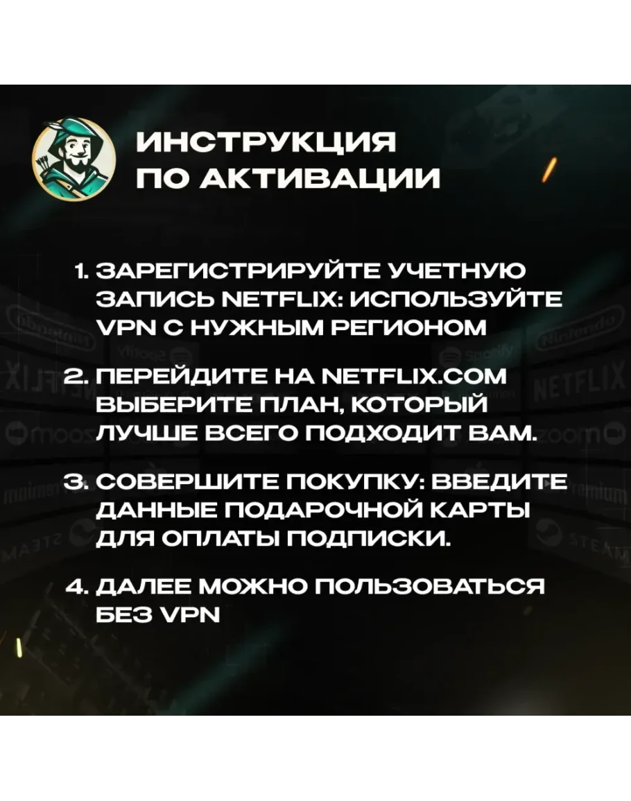 Карта подходит только для аккаунтов Netflix с регионом ЕВРОПА. Код необходимо активировать в течение 1 дня после покупки.