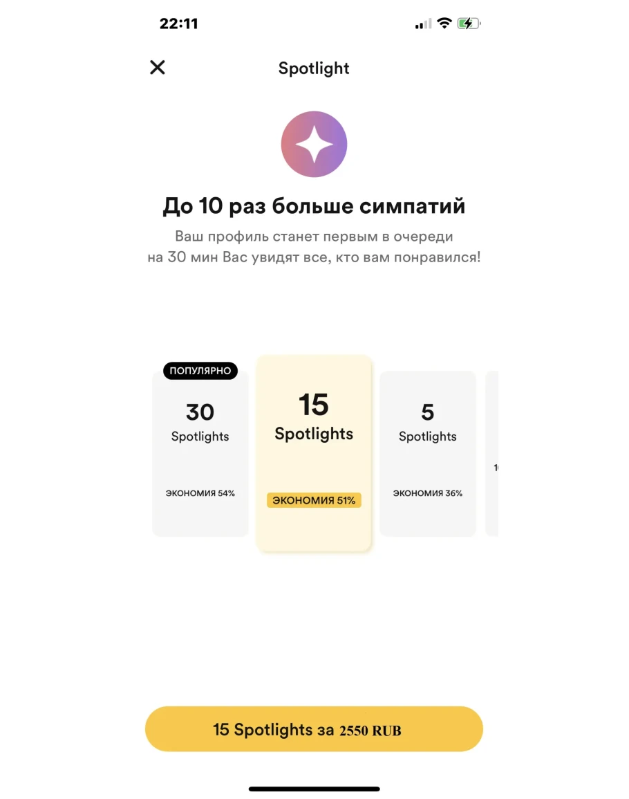 Spotlight (аналог Буста в Тиндер) – До 10 раз больше симпатий! Ваш профиль станет первым в очереди на 30 минут. Вас увидят все, кто вам понравился!