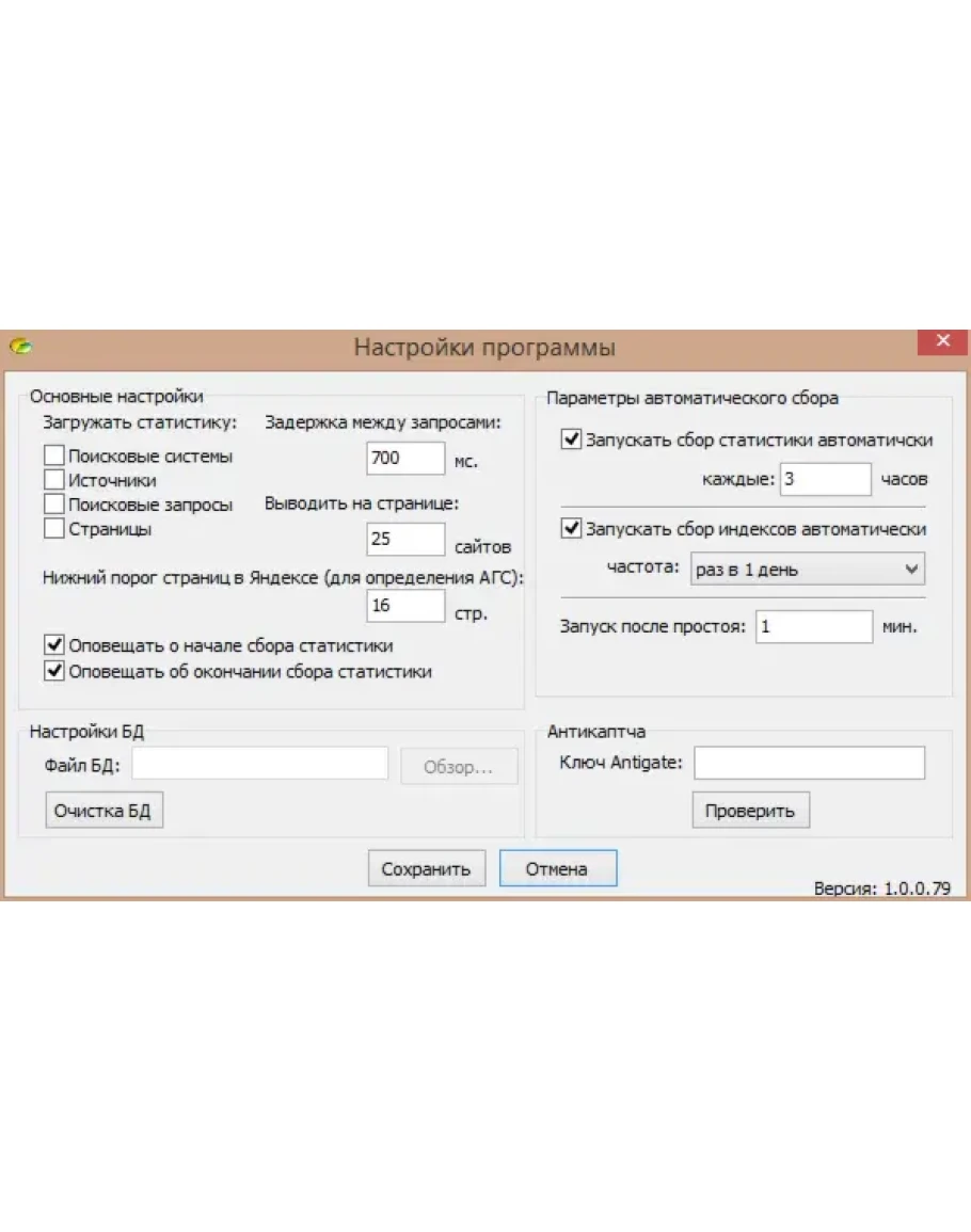 - Имеется возможность обхода каптчи от Яндекса с помощью Antigate