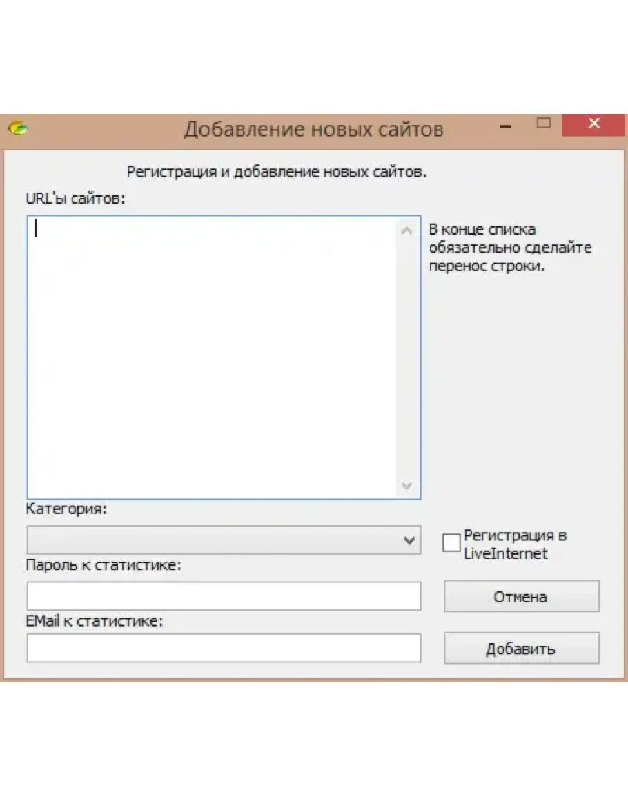 - Возможность массового добавления сайтов в программу с одновременной регистрацией в LiveInternet