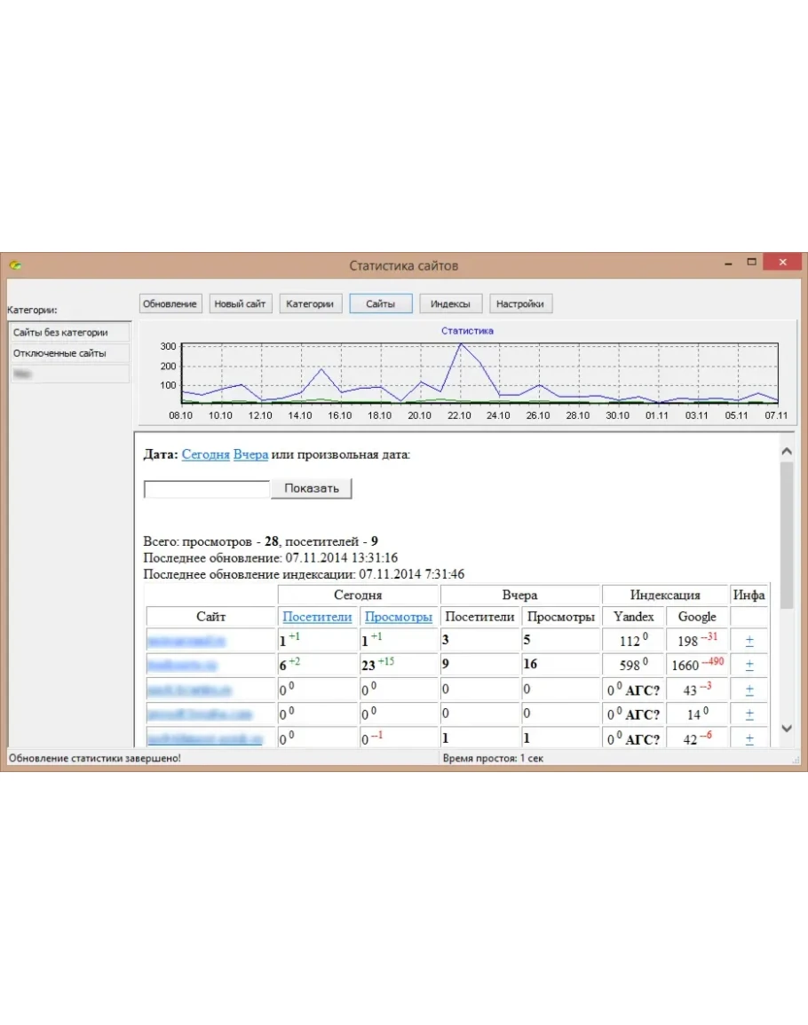 Данная десктопная программа, разработанная нами, поможет вам следить за статистикой посещаемости всех сайтов, а также изменения индексации сайтов в количестве до 500 штук.