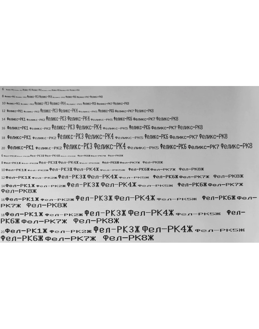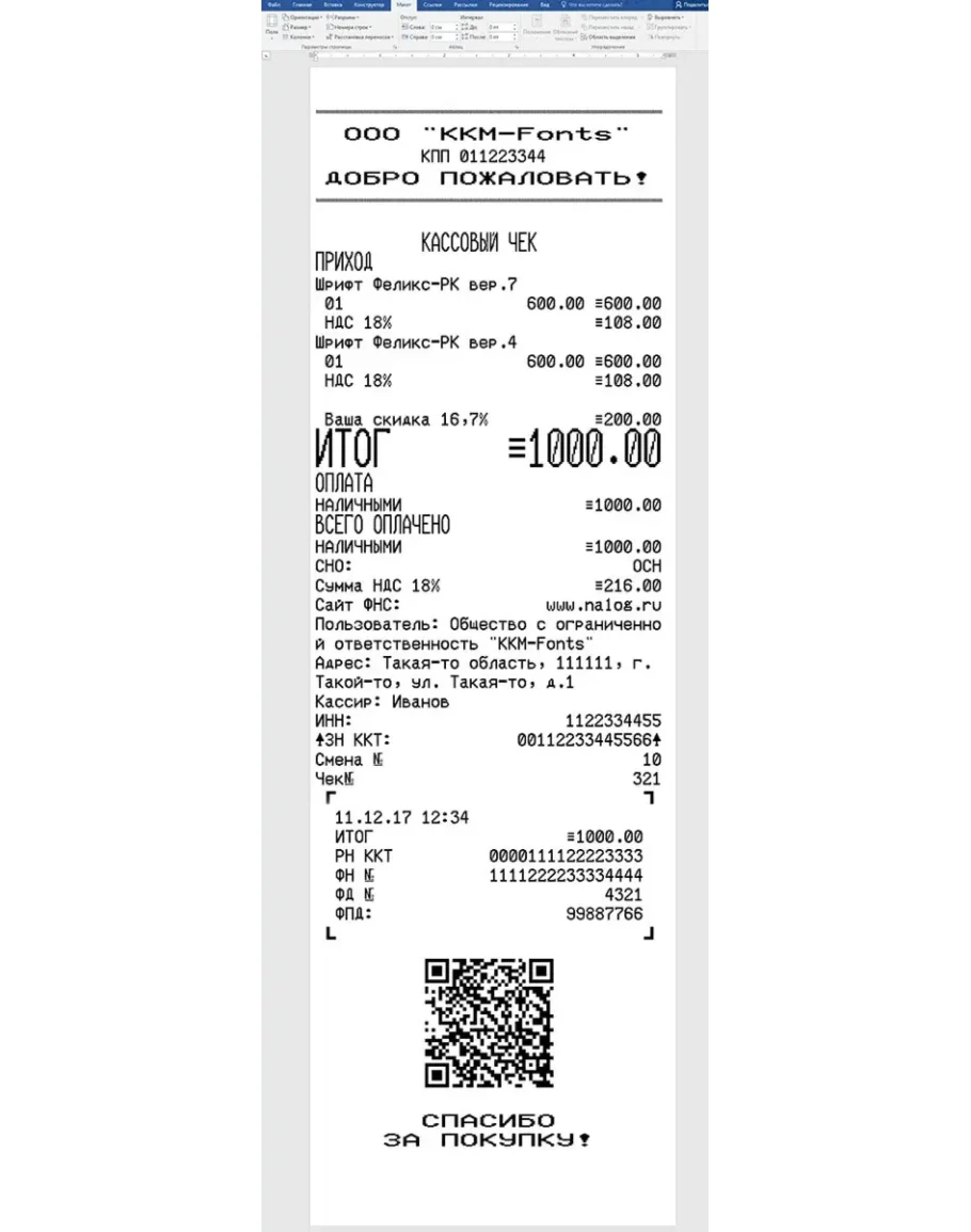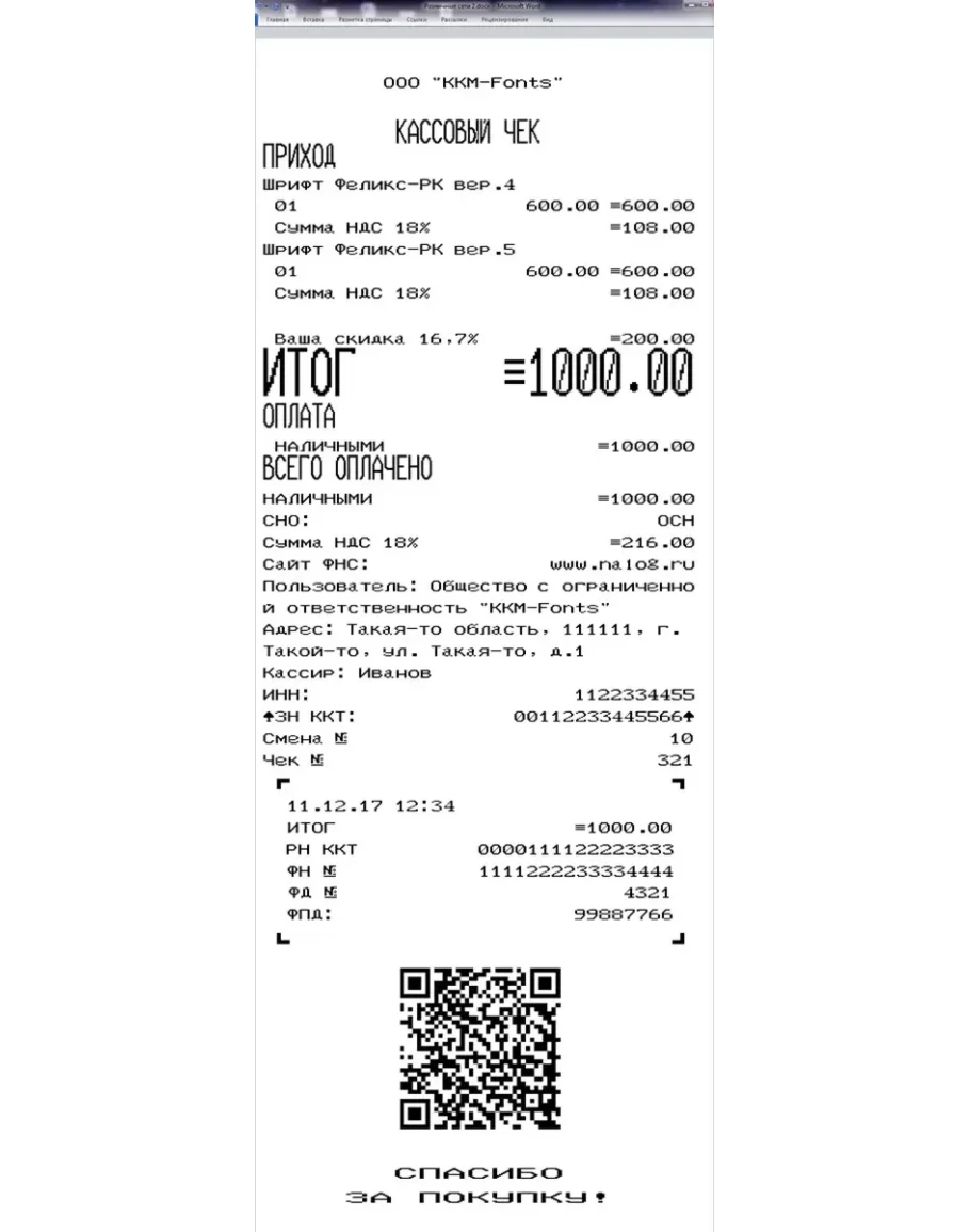 Данный полный набор шрифтов кассового аппарата ФЕЛИКС-РК содержит 8 версий шрифтов (1-8) в формате TTF (русские и английские буквы) для использования в программе Microsoft Word. В архиве находятся стандартные и широкие шрифты для каждой версии (всего 16 шрифта) в формате TTF и шаблоны вариантов чеков. Зачастую магазины используют в одном чеке несколько видов шрифтов с целью защиты чека от подделки. Данный набор позволит Вам повторить любой чек, напечатанный на данном аппарате, в частности ЛЕРУА МЕРЛЕН, КАРАВАН, РУБЛЬ БУМ и т.д. Вам остается только установить шрифты в систему (обычно C:\WINDOWS\Fonts), открыть шаблон и начать редактирование. Печатать чеки предпочтительно на термопринтере, на кассовой термоленте. Хотя можно печатать и на струйнике и лазерном, с возможностью вывода на факсовую бумагу. Лучшее качество, естественно, при печати на термопринтерах.