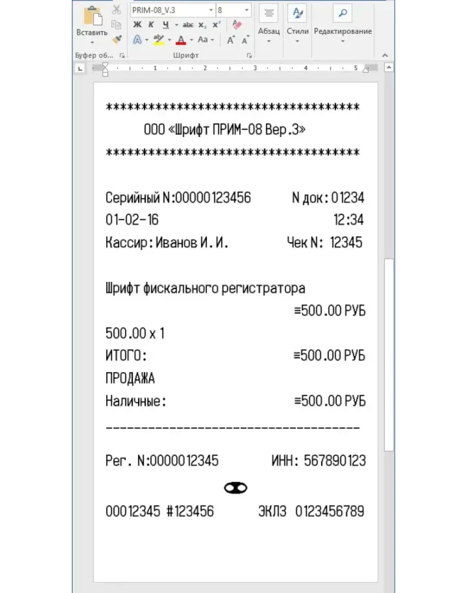 Данный полный набор шрифтов кассового аппарата ПРИМ-08 содержит все 3 версии шрифтов в формате TTF (русские и английские буквы) для использования в программе Microsoft Word. В архиве находятся шрифты в формате TTF и шаблоны вариантов чеков. Зачастую магазины используют в одном чеке несколько видов шрифтов с целью защиты чека от подделки. Данный набор позволит Вам повторить любой чек, напечатанный на данном аппарате. Вам остается только установить шрифты в систему (обычно C:\WINDOWS\Fonts), открыть шаблон и начать редактирование. Печатать чеки предпочтительно на термопринтере, на кассовой термоленте. Хотя можно печатать и на струйнике и лазерном, с возможностью вывода на факсовую бумагу. Лучшее качество, естественно, при печати на термопринтерах.