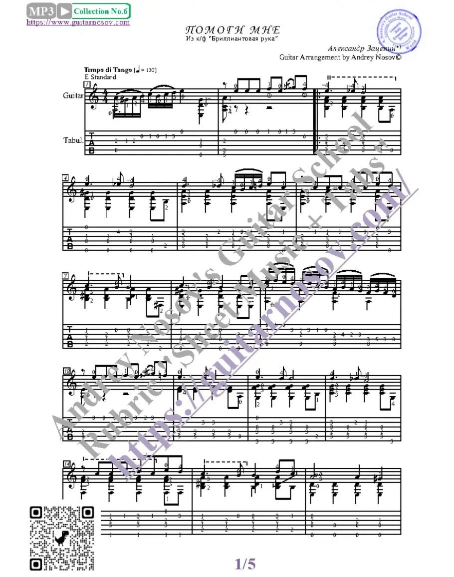 Кликните "Подробнее" для получения дополнительной информацииВашему вниманию предлагается композиция "Помоги мне (А.Зацепин)", предназначенная для исполнения на 6-ти струнной гитаре СОЛО. Запись выполнена нотами, сопровождена подробнейшей аппликатурой и продублирована табулатурой.