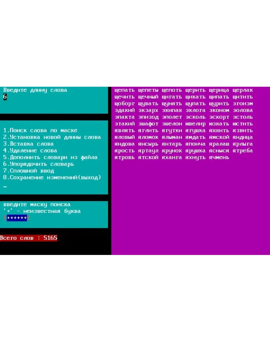 Творческое задание на Паскале. Программка очень простая. Запас слов около 25 тысяч. На картинке количество слов для длины в 6 букв.