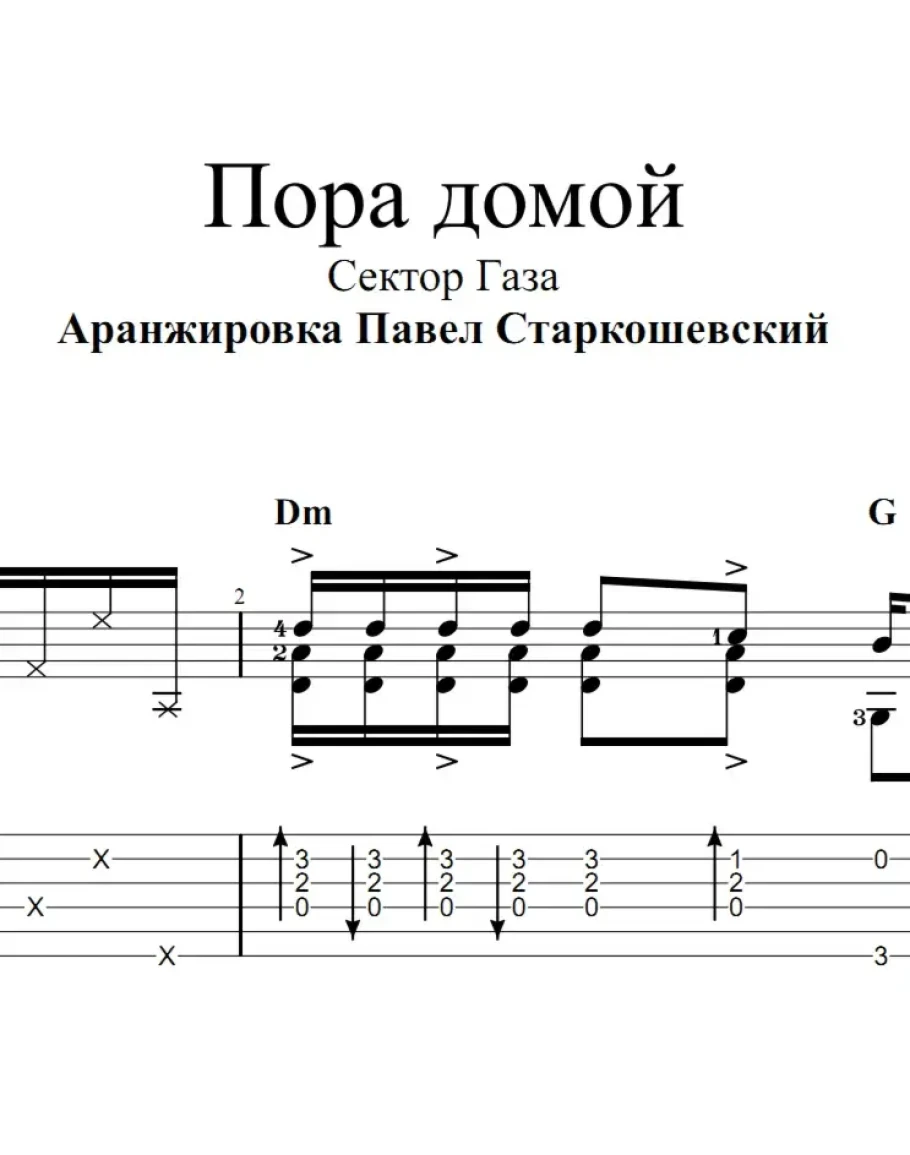Ноты для одной гитары с аппликатурой левой руки и табы к переложению песни группы Сектор Газа "Пора домой".