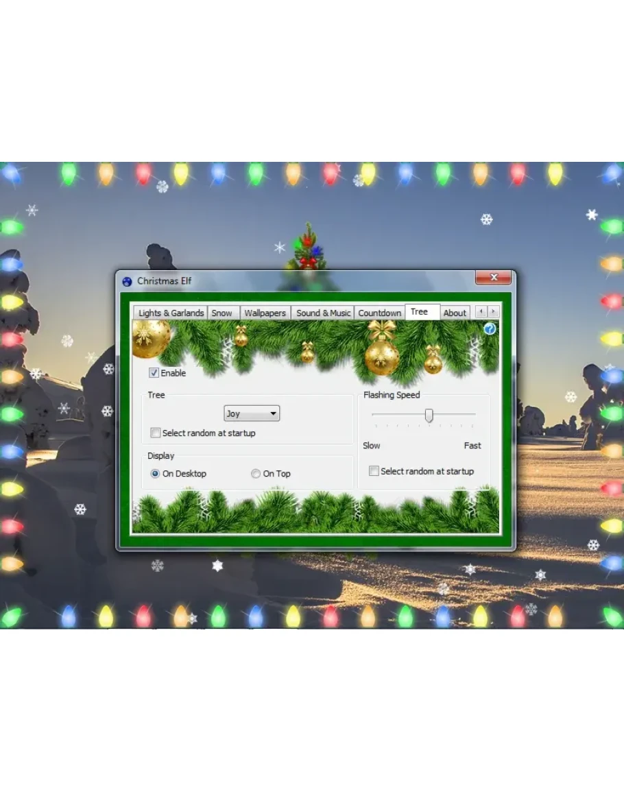 Центральное место на празднике по праву занимает новогодняя ёлка. Christmas Elf предоставляет на выбор несколько вариантов её украшения. Все с мигающими огоньками. Как и в случаях остальных составляющих Christmas Elf, некоторые параметры можно настраивать на свой вкус.
