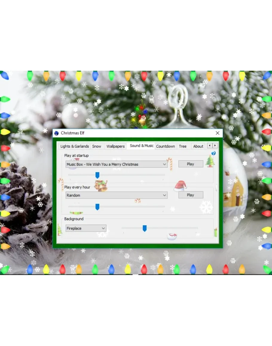 Популярные новогодние мелодии, проигрываемые, при желании, во время запуска программы и каждый час, не позволят вам забыть о приближении праздника и поддержат новогоднее настроение. Кроме того, можно включить приятные, характерные для зимней поры, фоновые звуки камина и метели.