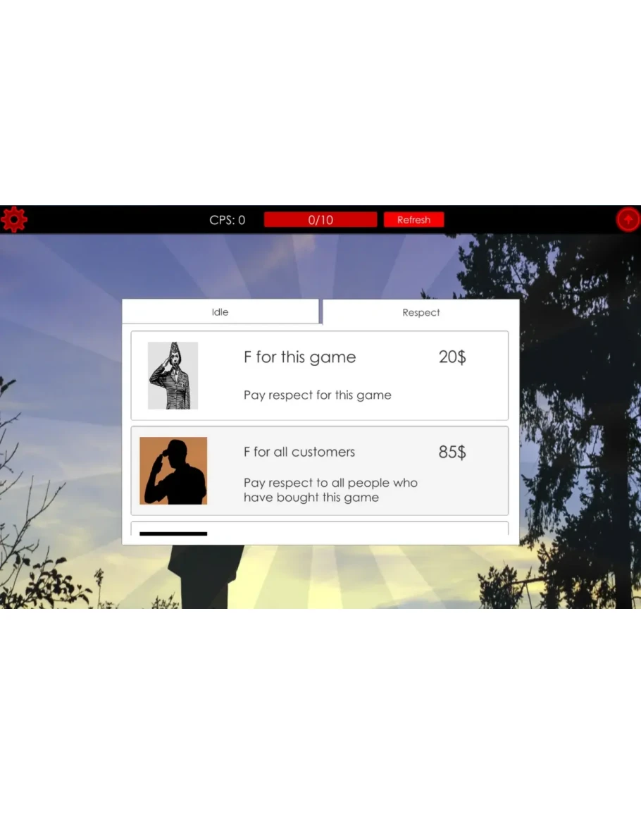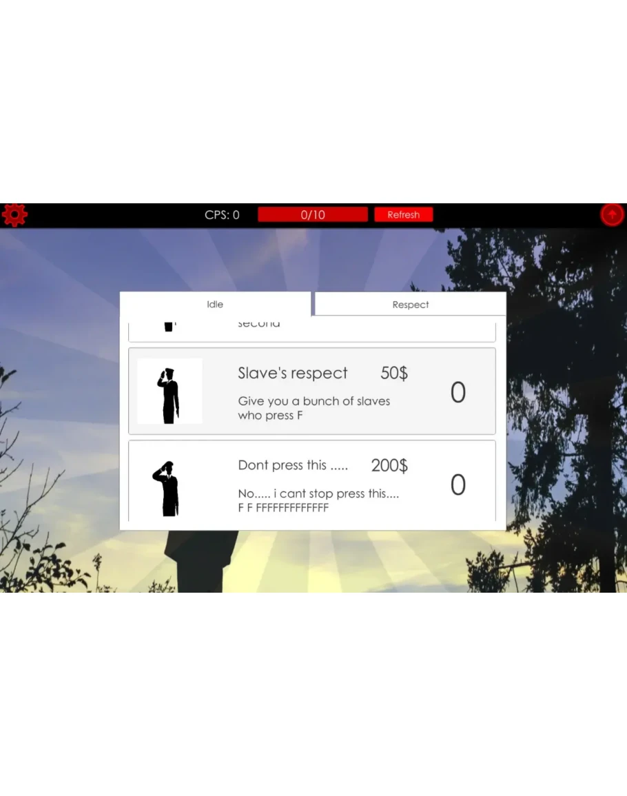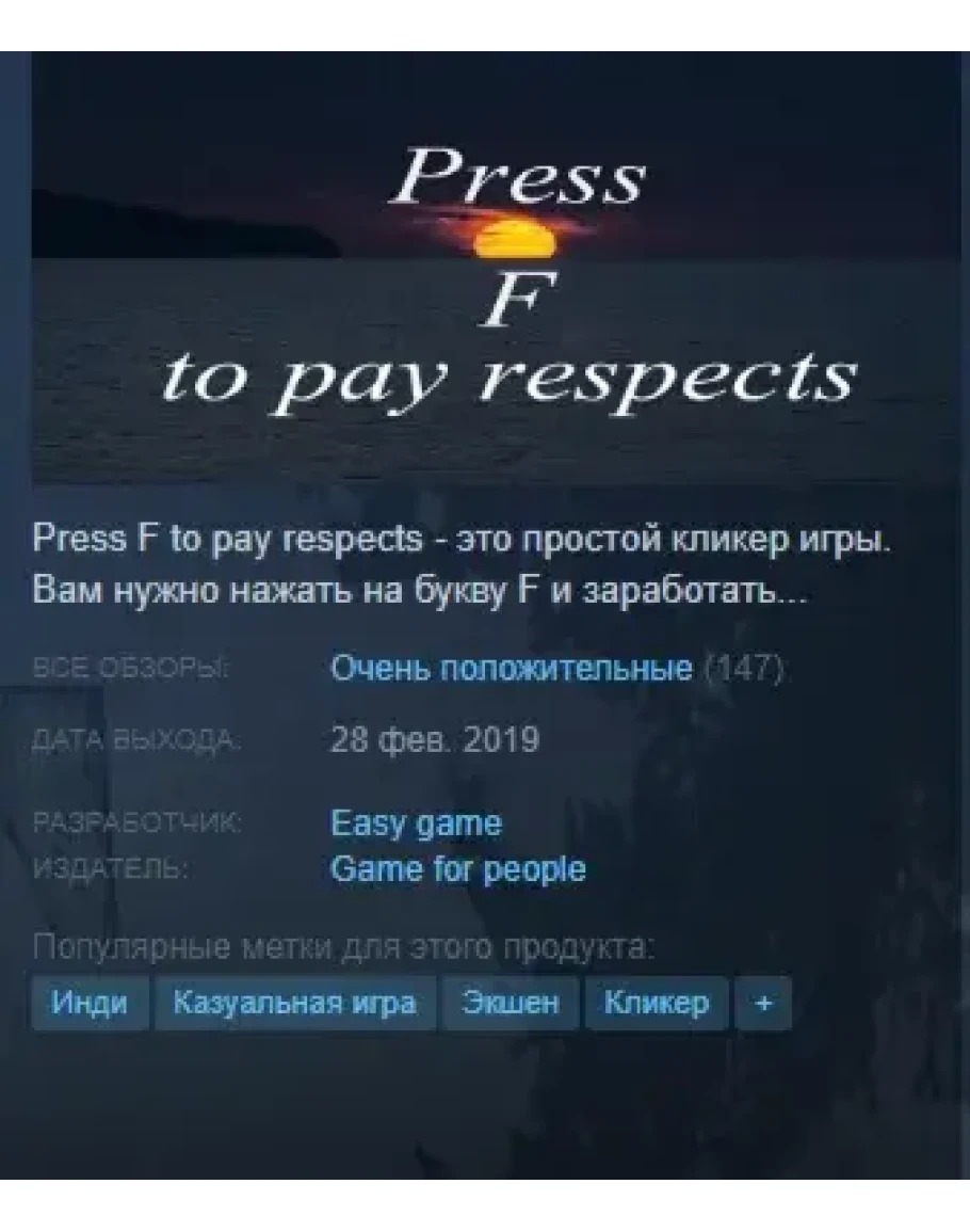Press F to pay respects - это простой кликер игры. Вам нужно нажать на букву F и заработать очки