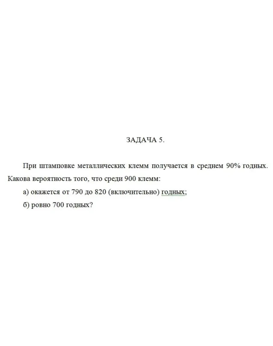 При штамповке металлических клемм получается в среднем 90% годных. Какова веро-ятность того, что среди 900 клемм: