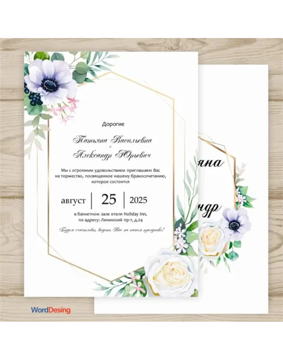 Приглашения на свадьбу сделано в профессиональных дизайнерских программах и для удобства и легкости редактирования текста было переведено в формат Microsoft Word, что дает Вам с легкостью поменять/добавить текст, размер шрифта, цвет текста.