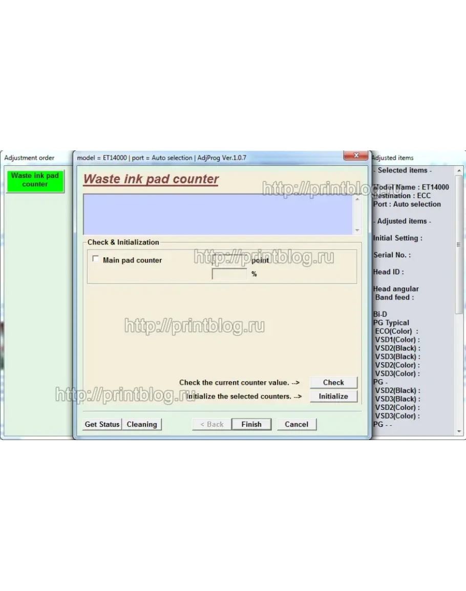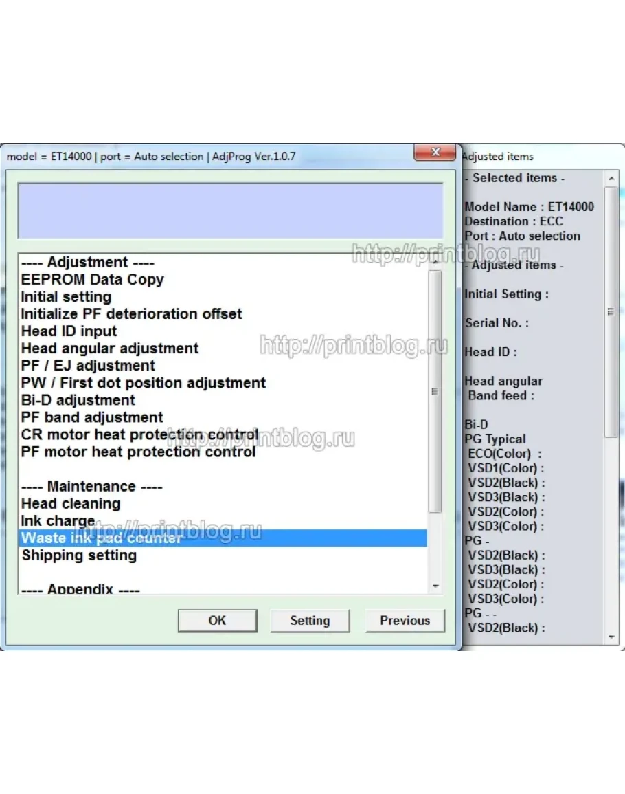 Adjustment program Epson ET-14000 - это сервисная программа для указанной модели принтера, программа позволяет сбросить счетчик памперса (отрботка, абсорбер), прописывать ID печатающей головки и другие функции.