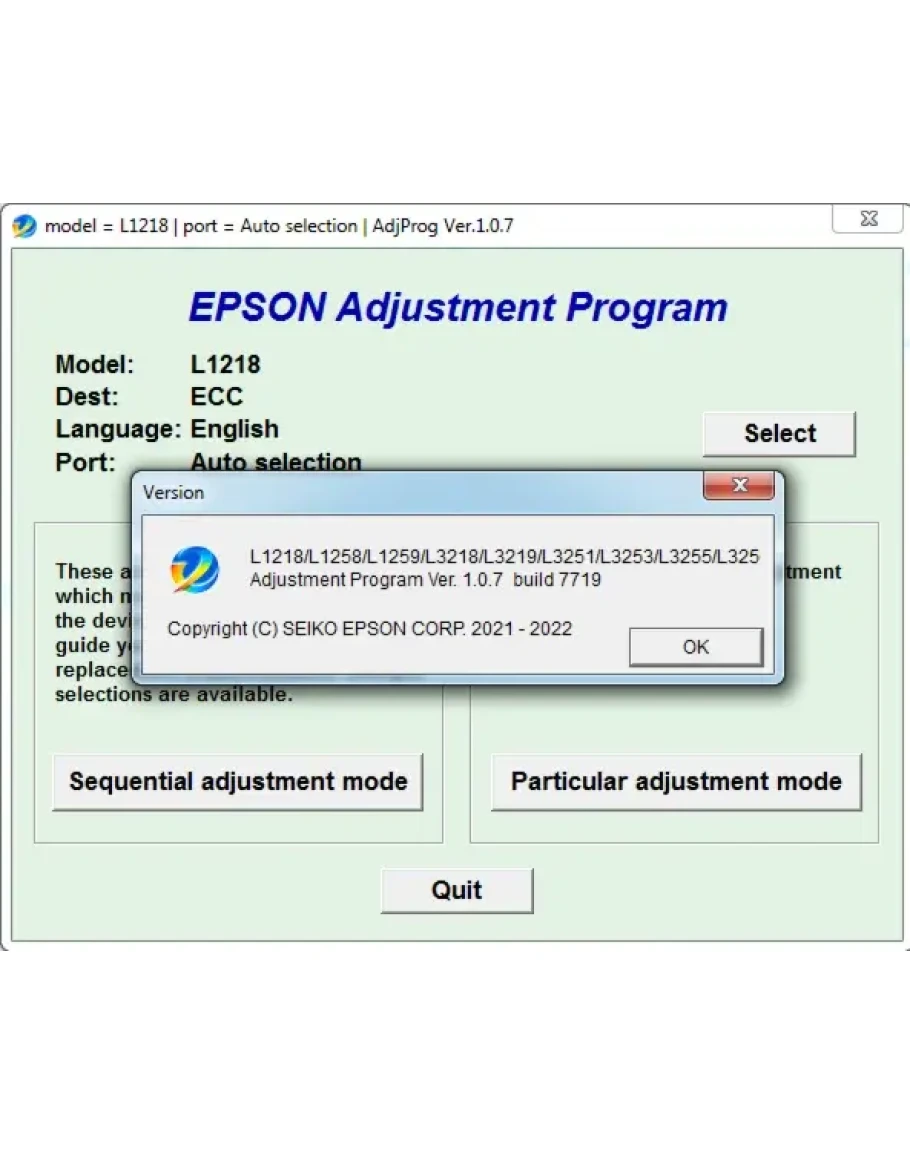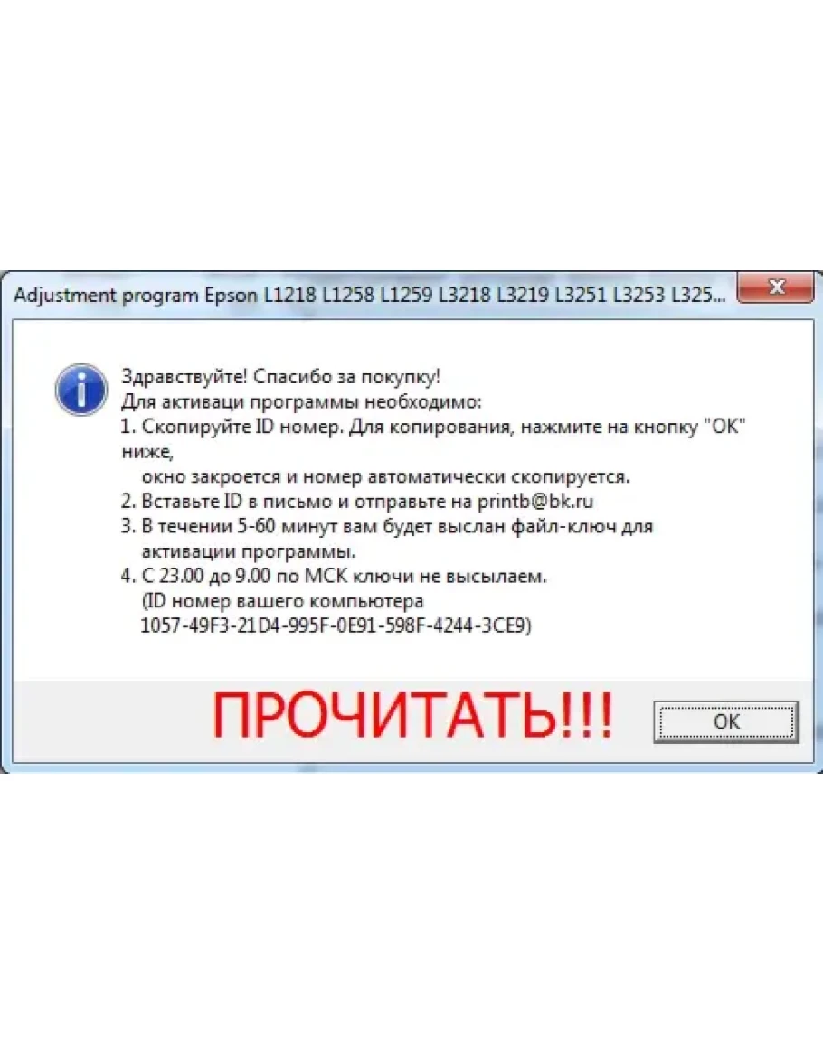 Запустите программу Adjprogr.exe двойным щелчком мыши. Появится окно с номером ID, копируете его нажатием кнопки «ОК» в этом окне (руками не набирать!) и отправляете его на наш email printb@bk.ru с темой «Я купил у вас программу Adjustment program Epson L1218»