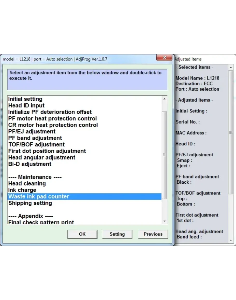 3) Программа сбрасывает счетчик Main pad counter, Platen pad counter, Ink System pad counter для следующих моделей принтеров: