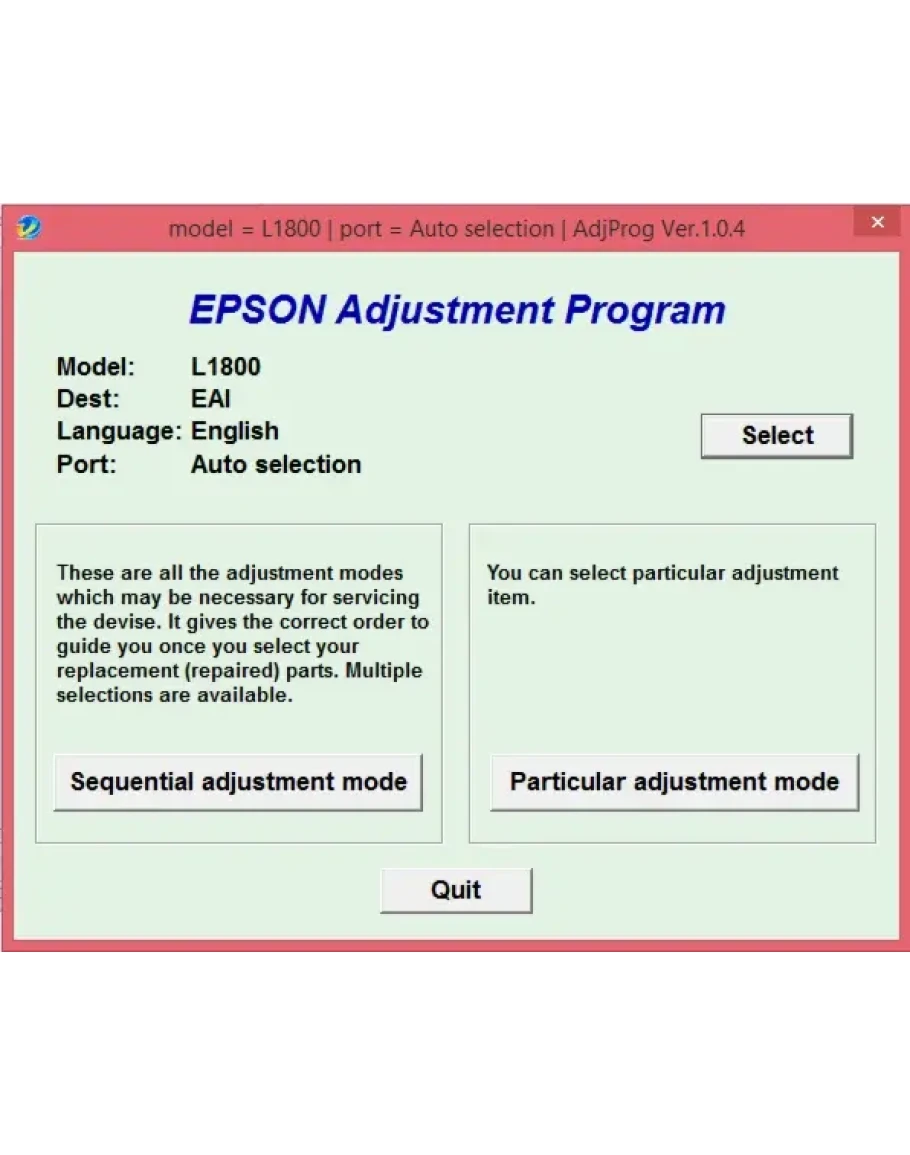 Adjustment program Epson L1800 - это сервисная программа, которая позволяет сбросить счетчик памперса (отрботка, абсорбер)неограниченное количество раз, прописывать ID печатающей головки, делать инициализацию принтера и другие функции.