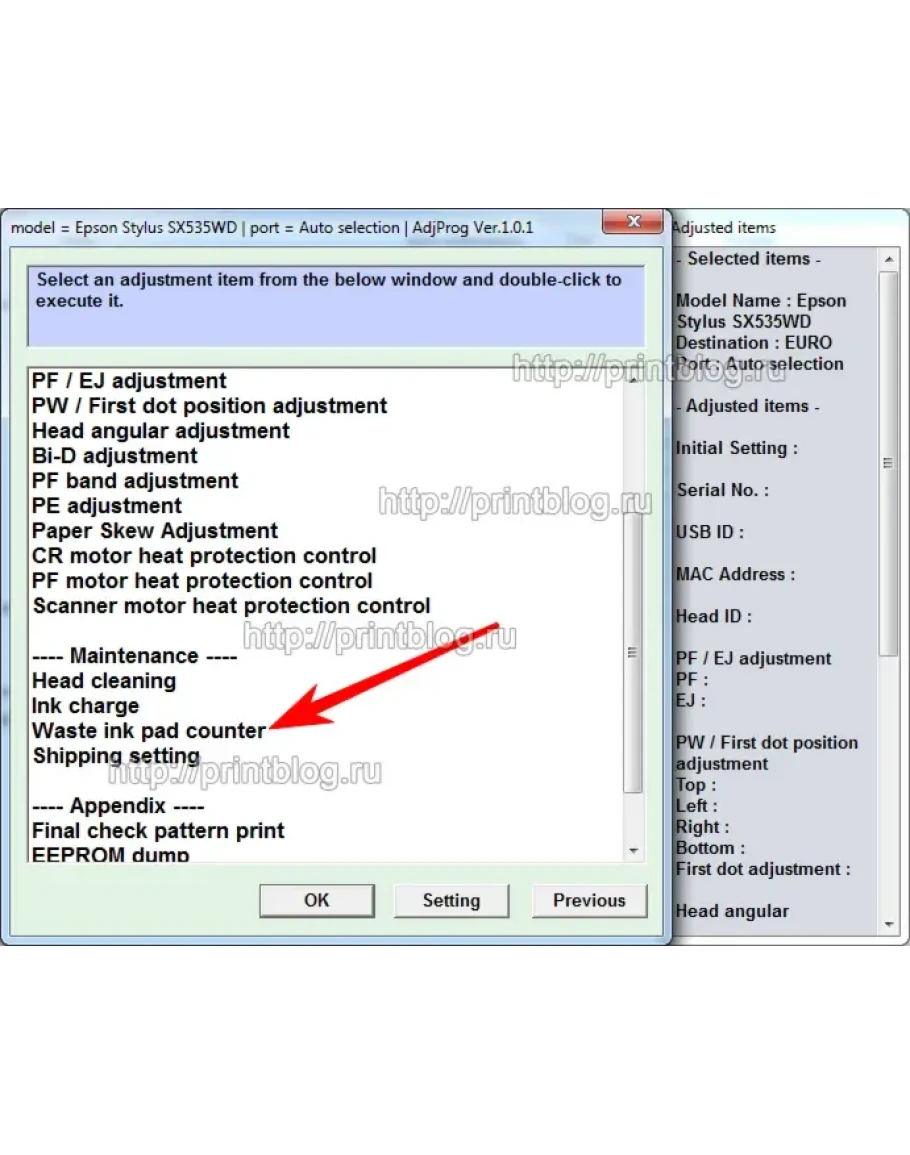 3. Программа сбрасывает счетчик Main pad counter для следующих моделей принтеров: SX535WD, Office BX535WD