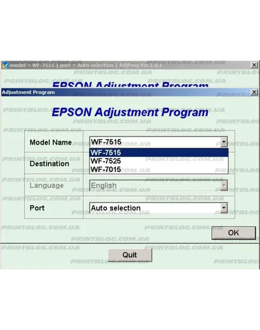 Adjustment program Epson WF-7515, WF-7015, WF-7525 - сервисная программа для сброса счетчика абсорбера (памперса) и выполнения других настроек принтера. Поддерживает принтеры Epson, таких моделей как: Epson WF-7515, WF-7510, WF-7015, WF-7010, WF-7525, WF-7520.