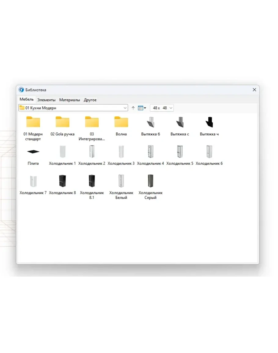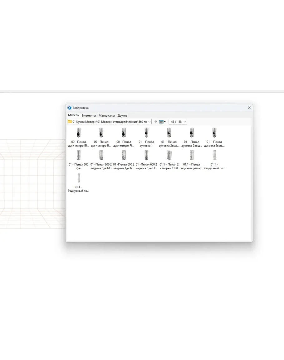 В комплекте идёт большая новая библиотека кухонь и шкафов 2024 года.