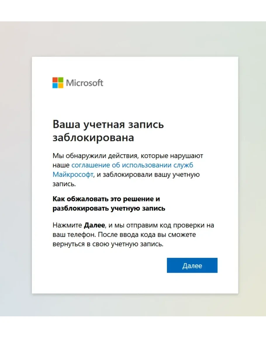 Мы обнаружили активность, нарушающую наше Соглашение об использовании служб Microsoft, и заблокировали вашу учетную запись.