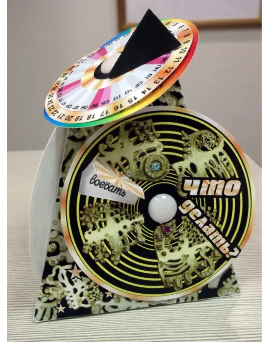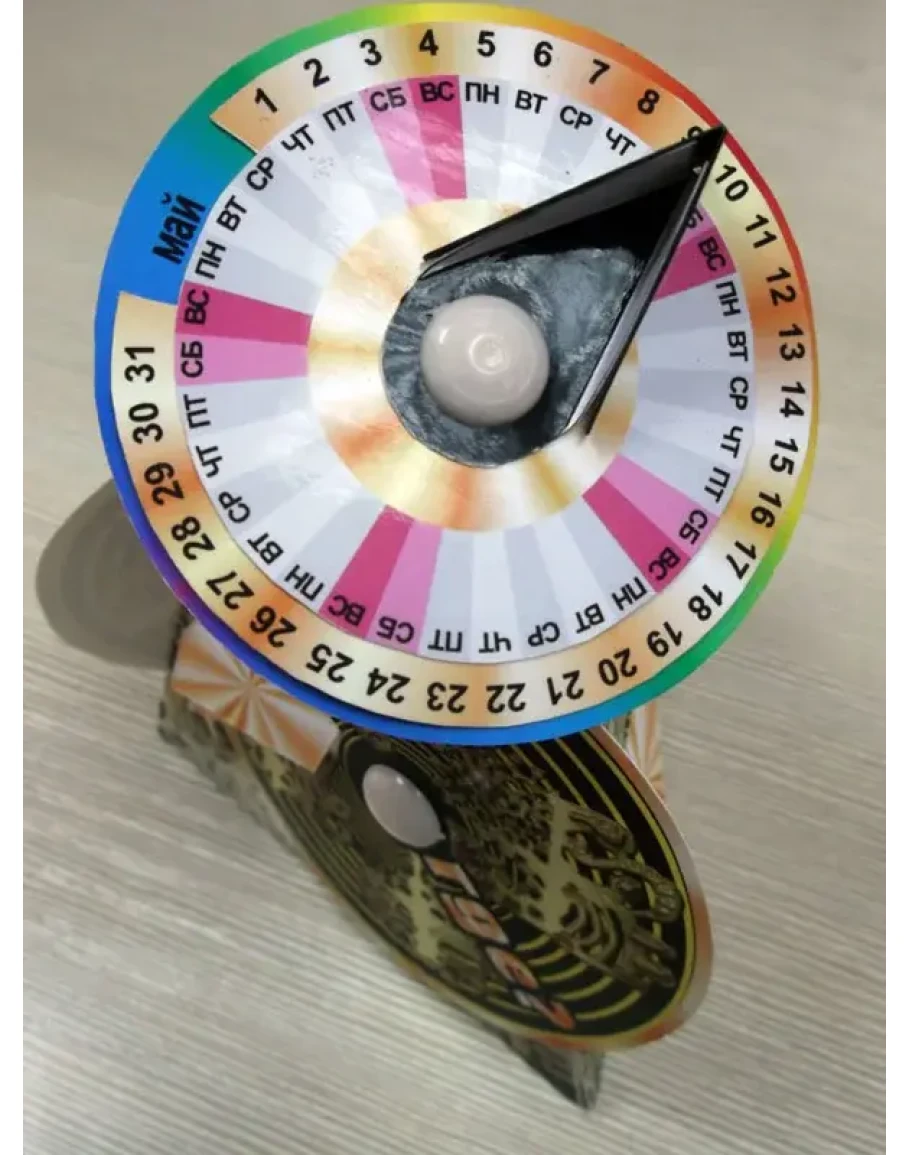 сторонах пирамидки - вращающиеся диски с окошечками. Сверху - круглый универсальный календарь, который можно