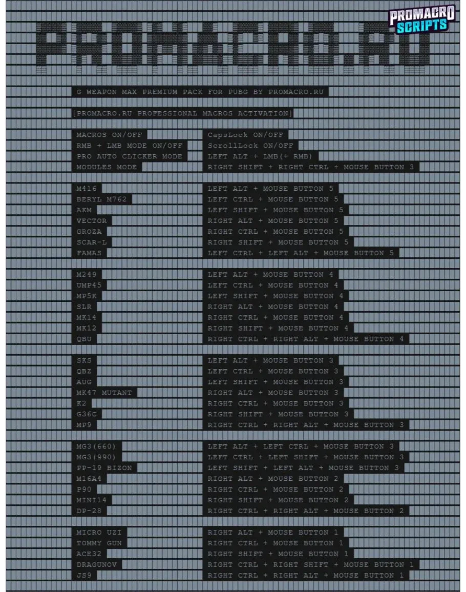 - PRO Weapon G макросы для JS9, M416, BERYL M762, AKM, VECTOR, GROZA, SCAR-L, FAMAS, M249, UMP45, MP5K, SLR, MK14, MK12, QBU, SKS, QBZ, AUG, MK47 MUTANT, K2, G36C, MP9, MG3, PP-19 BIZON, M16A4, P90, MINI14, DP-28, MICRO-UZI, TOMMY GUN и ACE32.