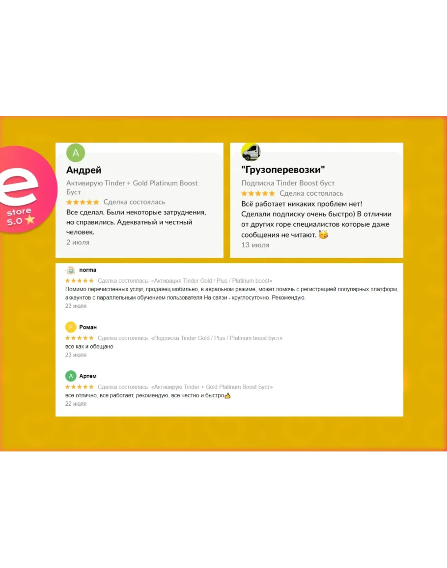 Пожалуйста, внимательно прочитайте описание и инструкцию товара перед покупкой, мы имеем право отказать в возврате денег, если вы купили не тот товар, нарушали правила сервиса, неправильно прочитали его или он вам не подходит, имейте ввиду что при спорных ситуациях от Вас потребуется скриншот письма с даты регистрации аккаунта Тиндер.