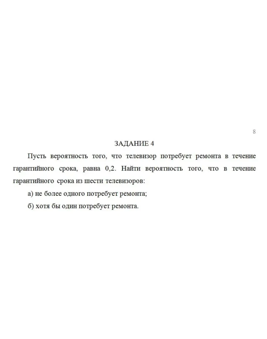 Пусть вероятность того, что телевизор потребует ремонта в течение гарантийного срока, равна 0,2. Найти вероятность того, что в течение гарантийного срока из шести телевизоров: