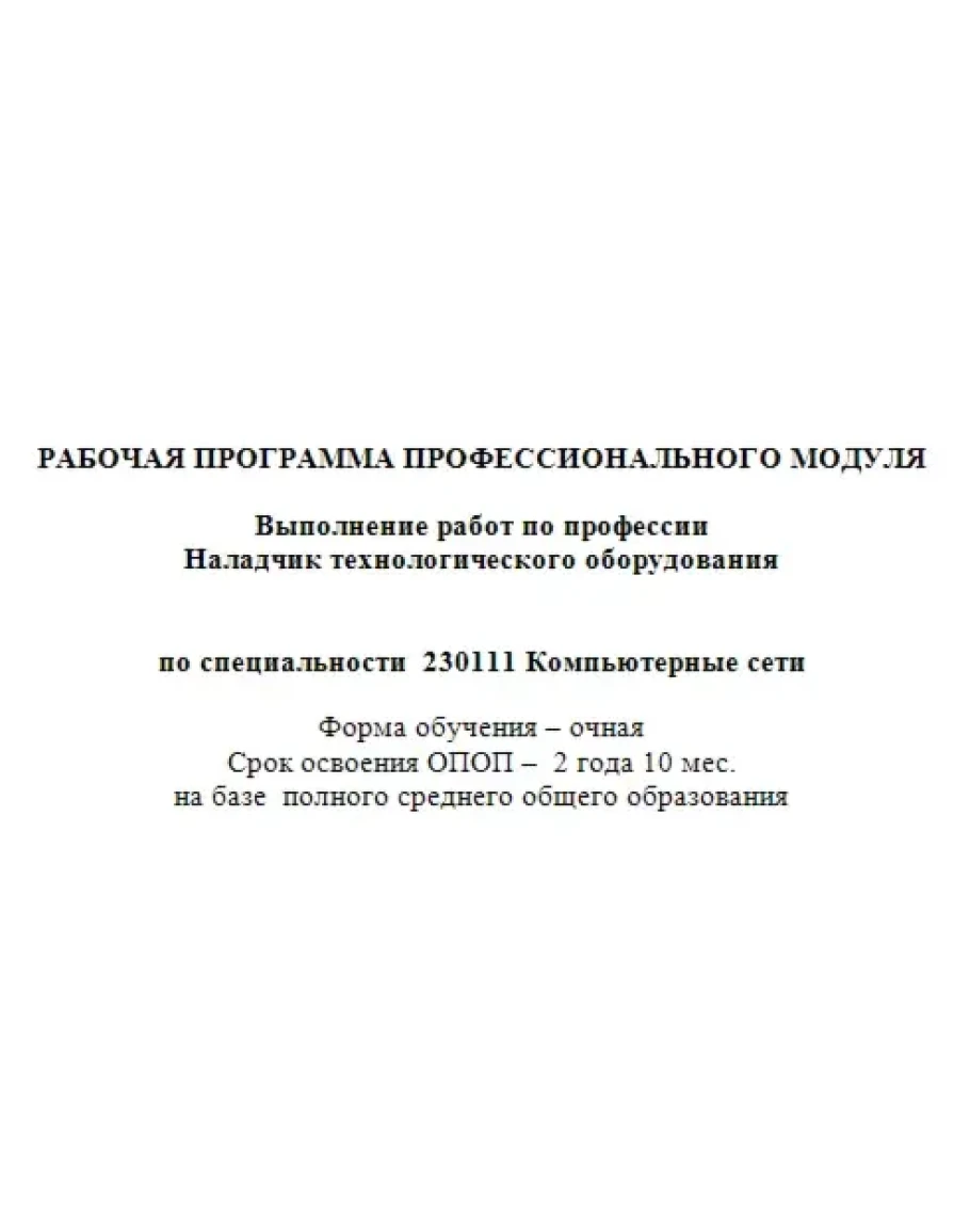 Рабочая программа по профессиональному модулю ПМ.04 Выполнение работ по профессии Наладчик технологического оборудования по специальности 230111 Компьютерные сети. Рабочая программа профессионального модуля разработана на основе Федерального государственного образовательного стандарта и примерной программы, рекомендованной ФГАУ ФИРО по специальности среднего профессионального образования (далее СПО) 230111 Компьютерные сети
