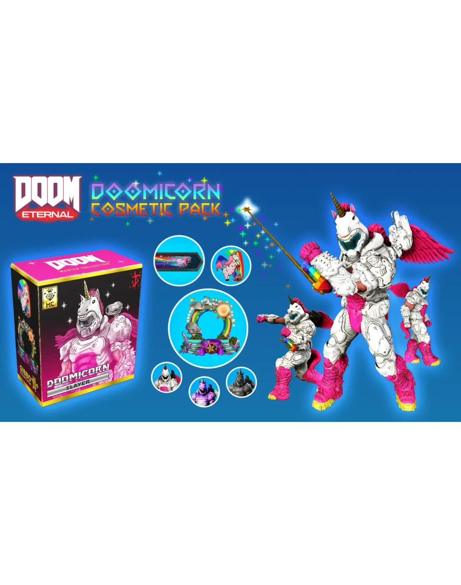 Пропустили набор «Единорок», ранее доступный только подписчикам Twitch? Купите его и станьте крутейшим скакуном ада с новыми обликами Палача, пьедесталами, анимацией, значком игрока и табличкой. * Для этого набора требуется базовая игра DOOM Eternal.