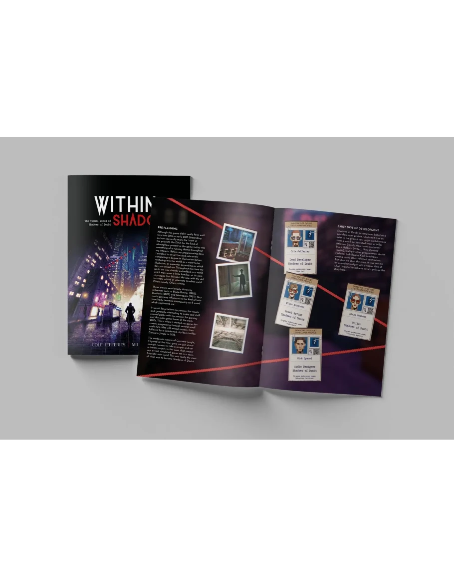 An 80 page art book with lots of written content detailing the visual world of Shadows of Doubt.