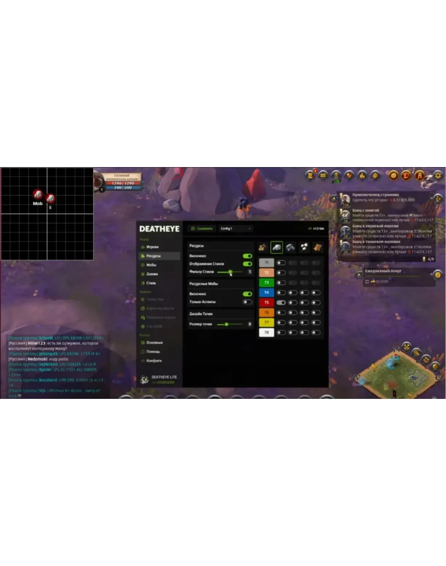 - Показывает Мобов (Ресурсные, Аспекты, Мировые, 'Прокнутые мировые', Виспы, Боссы мглы, Сундуки, Ивент, Ловушки и Птицы в корраптах)