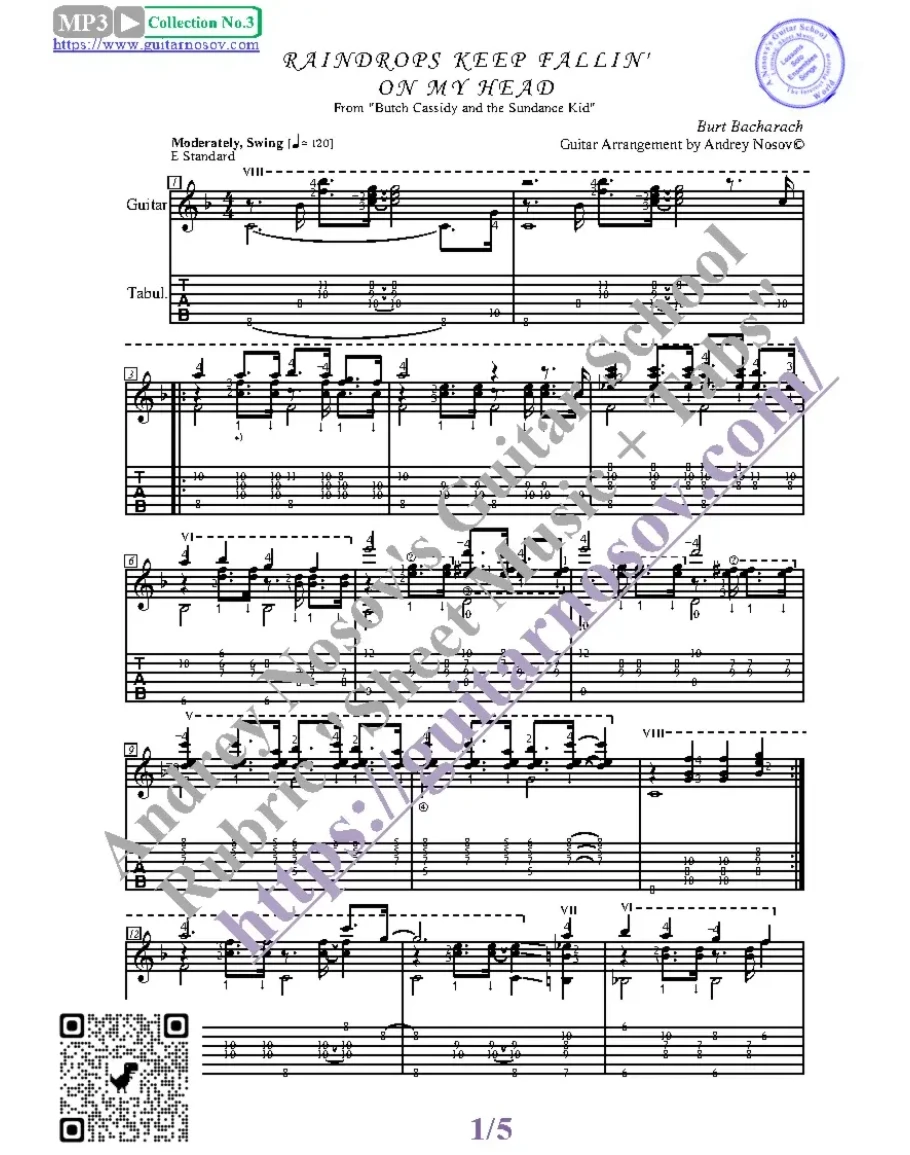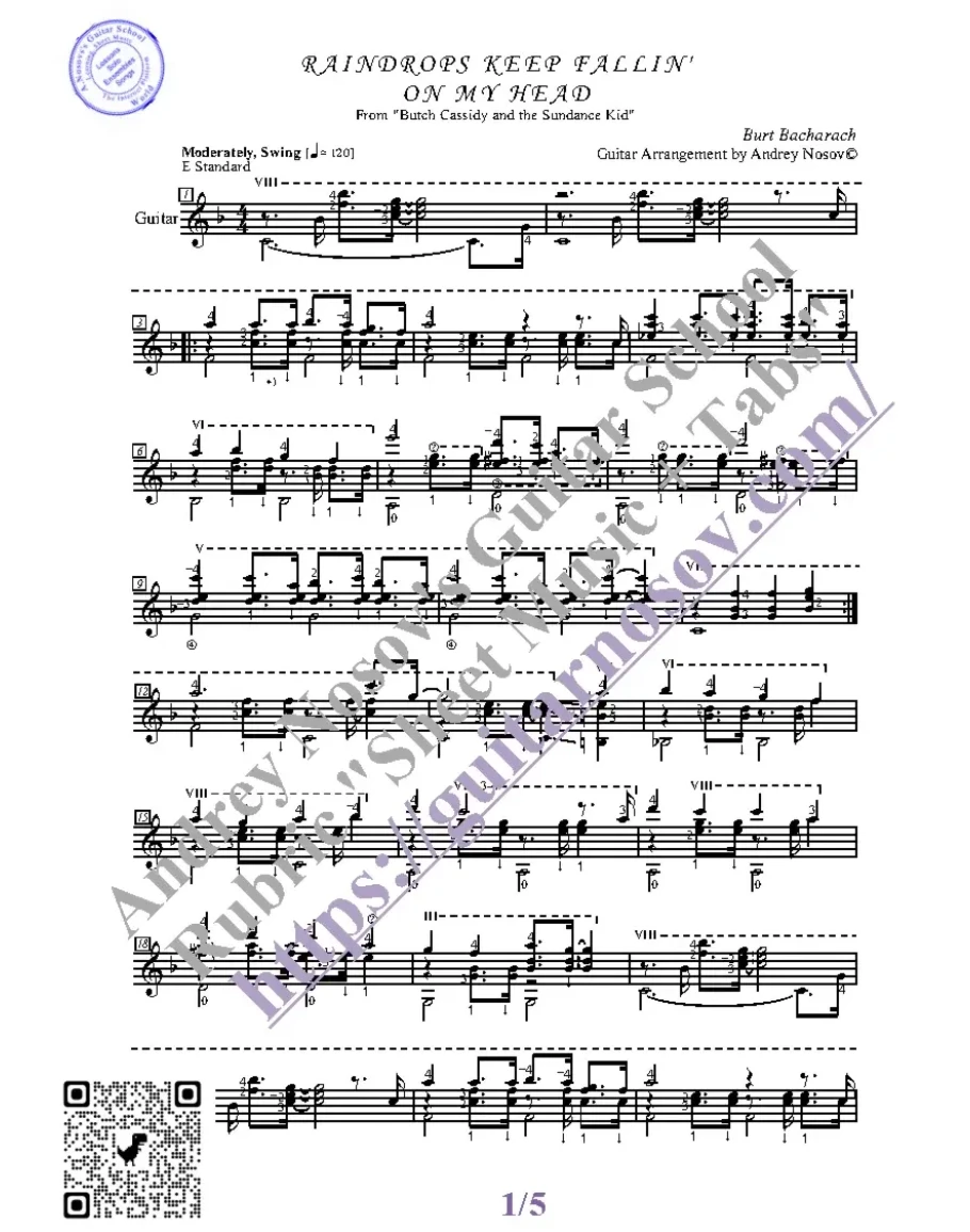Кликните "Подробнее" для получения дополнительной информацииВашему вниманию предлагается композиция "Raindrops Keep Fallin' on My Head (B.Bacharach)", предназначенная для исполнения на 6-ти струнной гитаре СОЛО. Запись выполнена нотами, сопровождена подробнейшей аппликатурой и продублирована табулатурой.