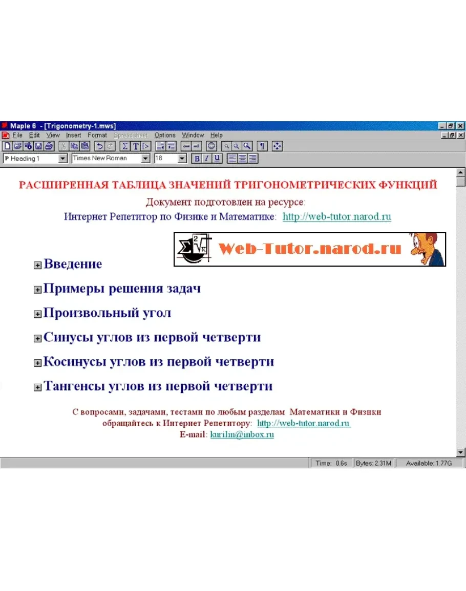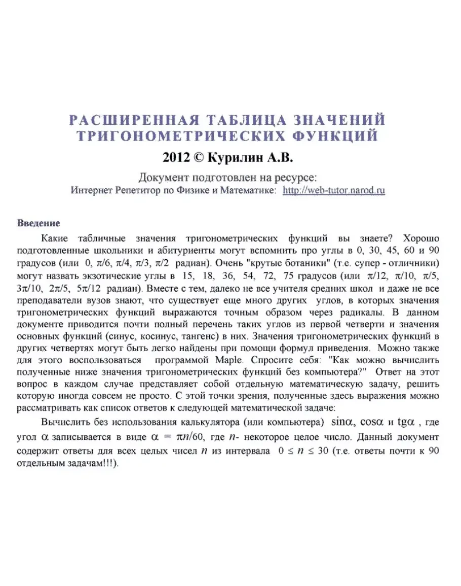 Файл в формате PDF содержит расширенную таблицу значений тригонометрических функций в углах из первой четверти. В отличие от известных таблиц В.М.Брадиса, в документе приводятся точные значения основных тригонометрических функций (синуса, косинуса, тангенса), выраженнные через радикалы. Значения углов изменяются в интервале от 0 до 90 градусов с шагом в 3 градуса. Это почти полная таблица всех углов тригонометрических функций, значения в которых могут вычислены точно без применения компьютера. Значения тригонометрических функций были получены при помощи программ символьных вычислений Maple и Mathematica. PDF-файл, содержащий 21 страницу, открывется программой Adobe Acrobat Reader полностью готов к просмотру на компьютере и печати на принтере. Ссылка для установки бесплатной программы Adobe Acrobat Reader прилагается.
