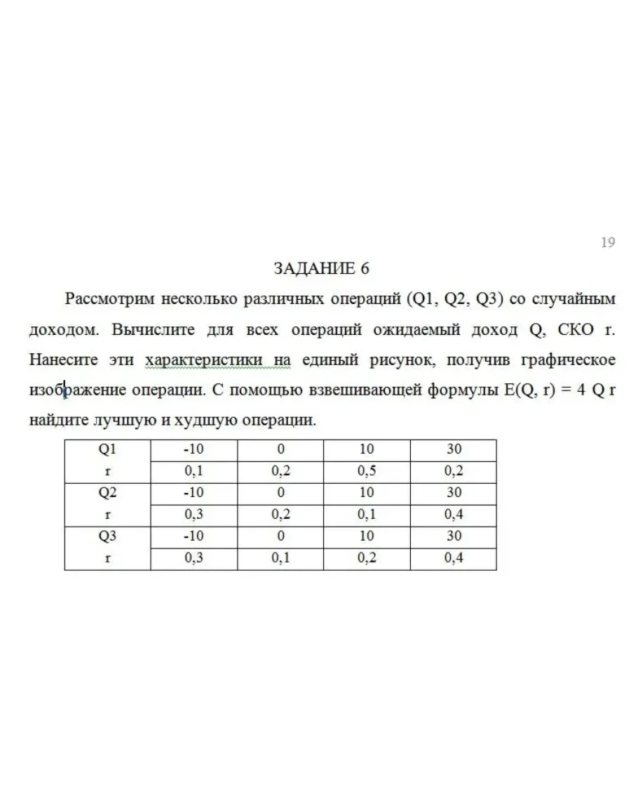 Рассмотрим несколько различных операций (Q1, Q2, Q3) со случайным доходом. Вычислите для всех операций ожидаемый доход Q, СКО r. Нанесите эти характеристики на единый рисунок, получив графическое изображение операции. С помощью взвешивающей формулы E(Q, r) = 4 Q r найдите лучшую и худшую операции.