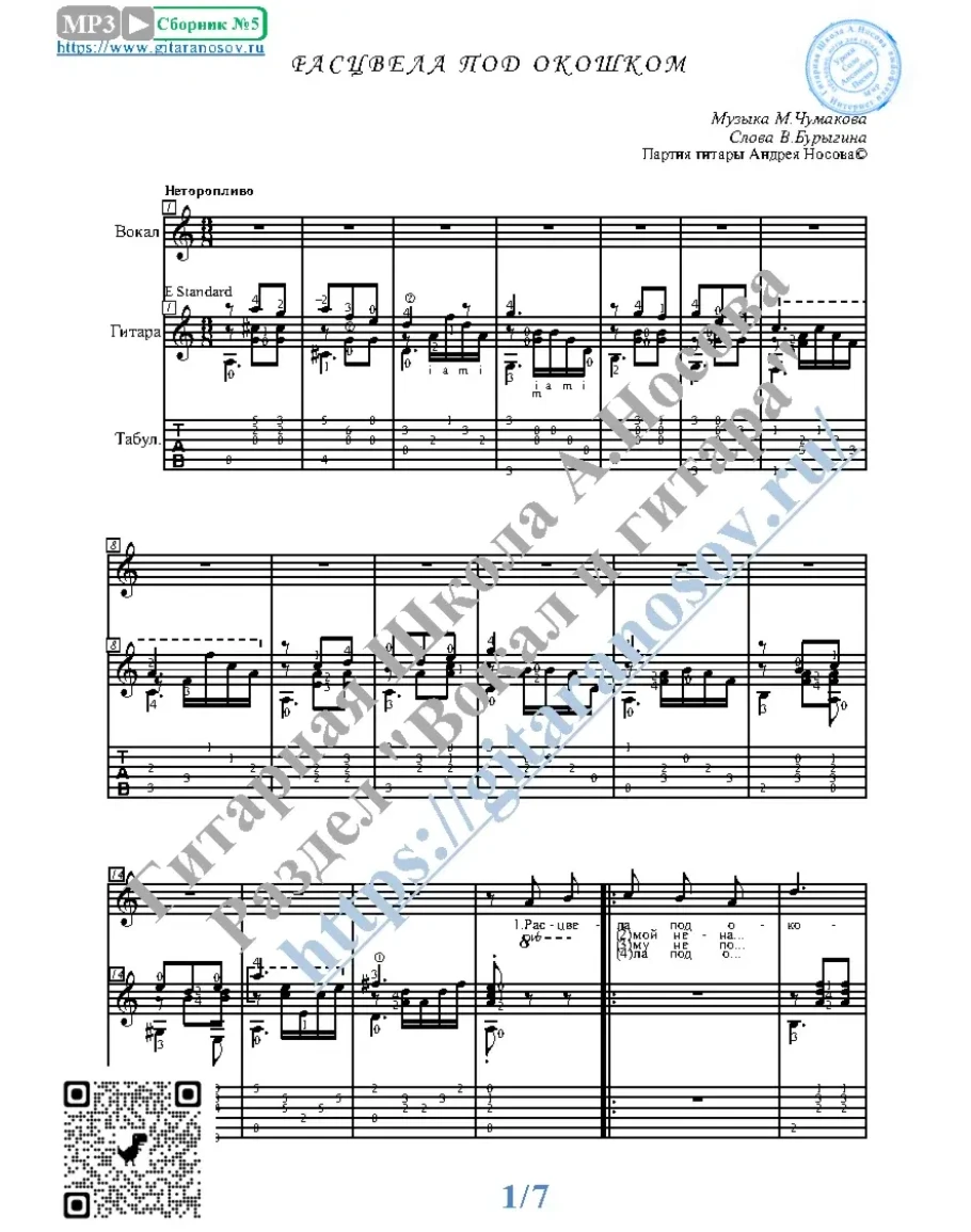 Кликните "Подробнее" для получения дополнительной информацииВашему вниманию предлагается композиция "Расцвела под окошком (муз.М.Чумакова, сл.В.Бурыгина)", предназначенная для вокала в сопровождении 6-ти струнной гитары. Запись выполнена нотами и включает в себя партию вокала с подтекстовкой, партию гитары с подробнейшей аппликатурой и текст песни (НА РУССКОМ).