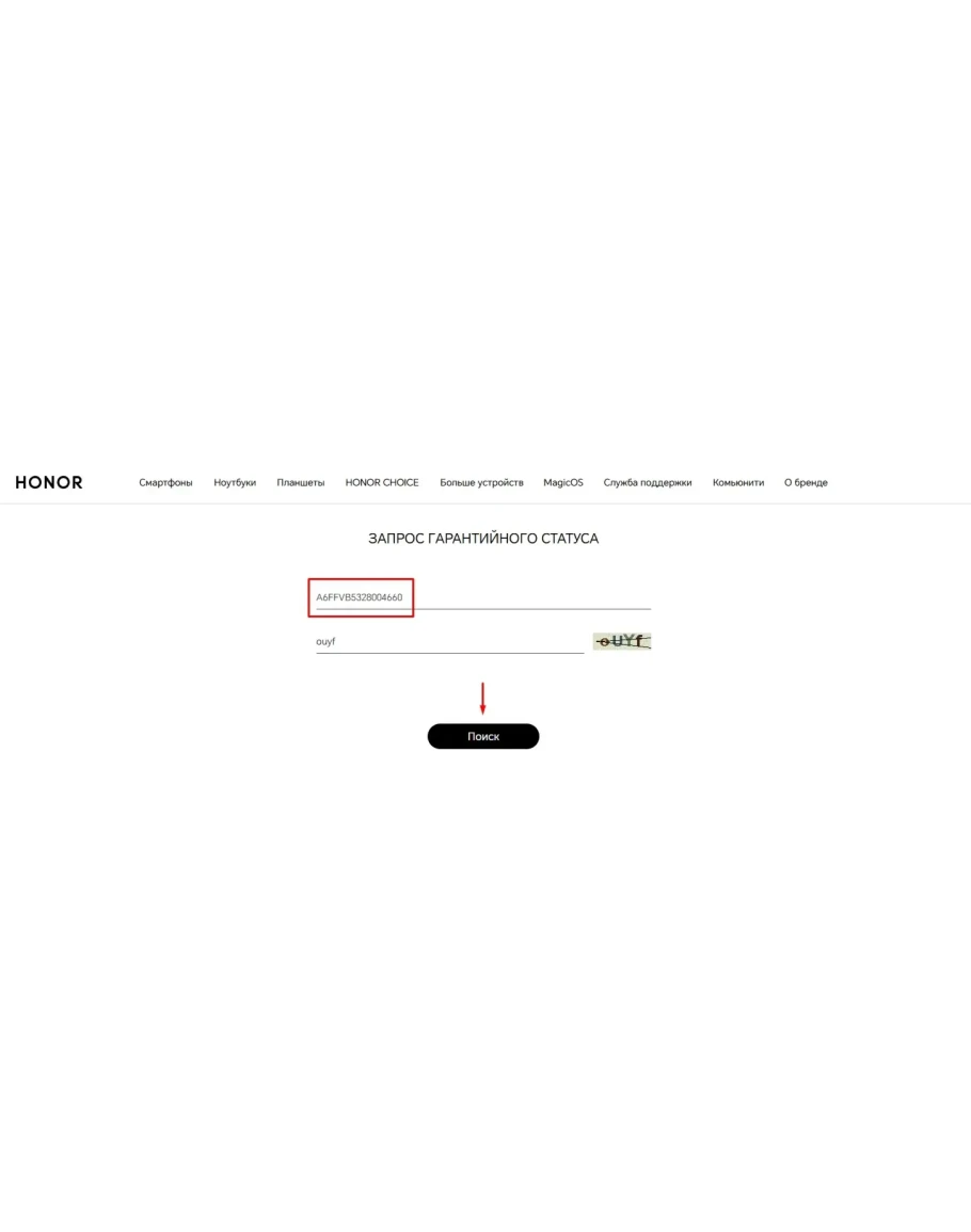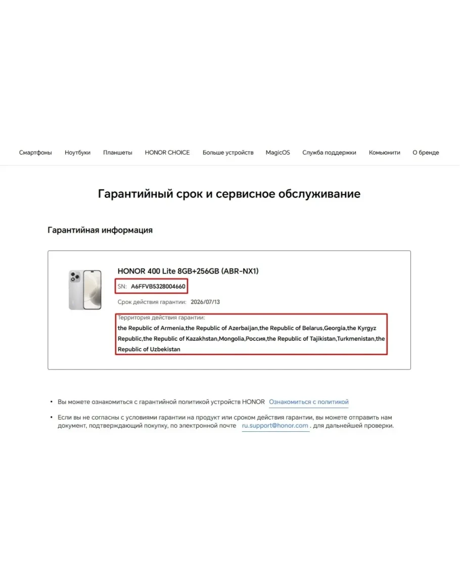 • Этот серийный номер проверяется на официальном сайте Honor для подтверждения модели и, что критически важно, страны продажи (региона) устройства. Это необходимо для корректного расчета кода.
